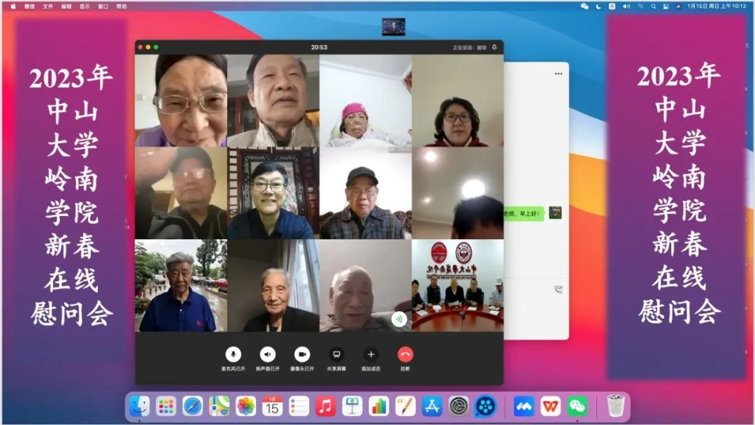 “小年至,年味浓”,1月15日上午,伴随着小年的脚步,岭南学院党委组织开展了一场别开生面的在线视频新春慰问离退休教职工活动。yl9193永利集团副校长兼岭南学院院长李善民、学院党委书记黄毅、副书记樊峰会、副院长鲁晓东、党委委员郭凯明等人通过微信在线视频的方式向学院离退休教职工代表们表达了衷心的祝福。学院离退休代表李智生、彭昆仁、石祖培、李龙、黄月兰、李仁兴、王美今、张文彪、徐泽鸿等9位老师在线参加了本次活动。