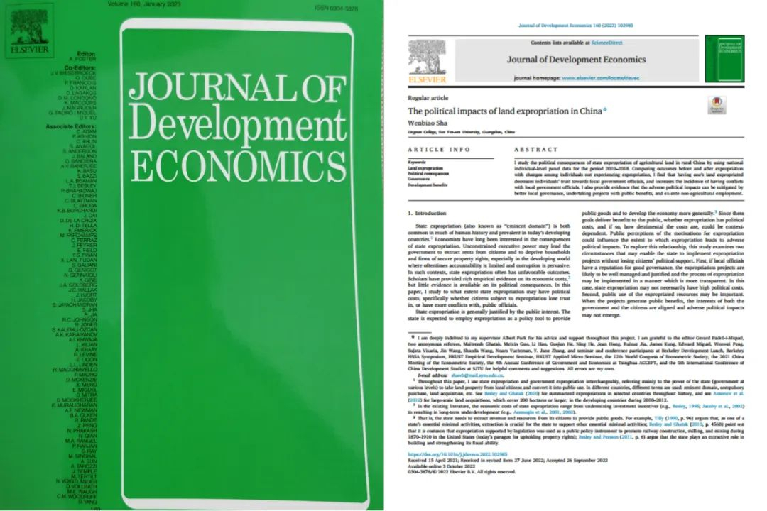 岭南学院沙文彪助理教授独立完成的论文“The political impacts of land expropriation in China”于2023年1月在发展经济学领域顶级期刊Journal of Development Economics上发表。