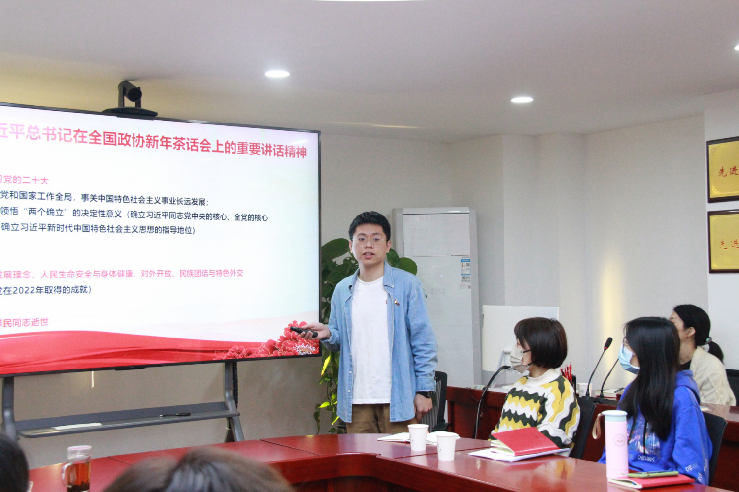李志惠同志分享了《学习贯彻习近平总书记在全国政协新年茶话会上的重要讲话精神》和《学习贯彻习近平总书记对爱国卫生运动作出的重要指示精神》。他提到,新年茶话会是党和国家领导人与各界人士代表畅谈友情、共商国是的重要平台,团结、民主是人民政协的两大主题,“全过程人民民主”是社会主义民主政治的本质属性,我们需要坚持并不断打牢共同思想政治基础,才能实现大团结大联合,才能实现最广泛、最真实、最管用的社会主义民主。他还分享了总书记对爱国卫生运动做出的重要指示,号召全体教职员工积极参加学院组织的健身打卡活动,以更加强健的体魄迎接未来工作上的挑战,以更加饱满的热情做到为人民服务。
