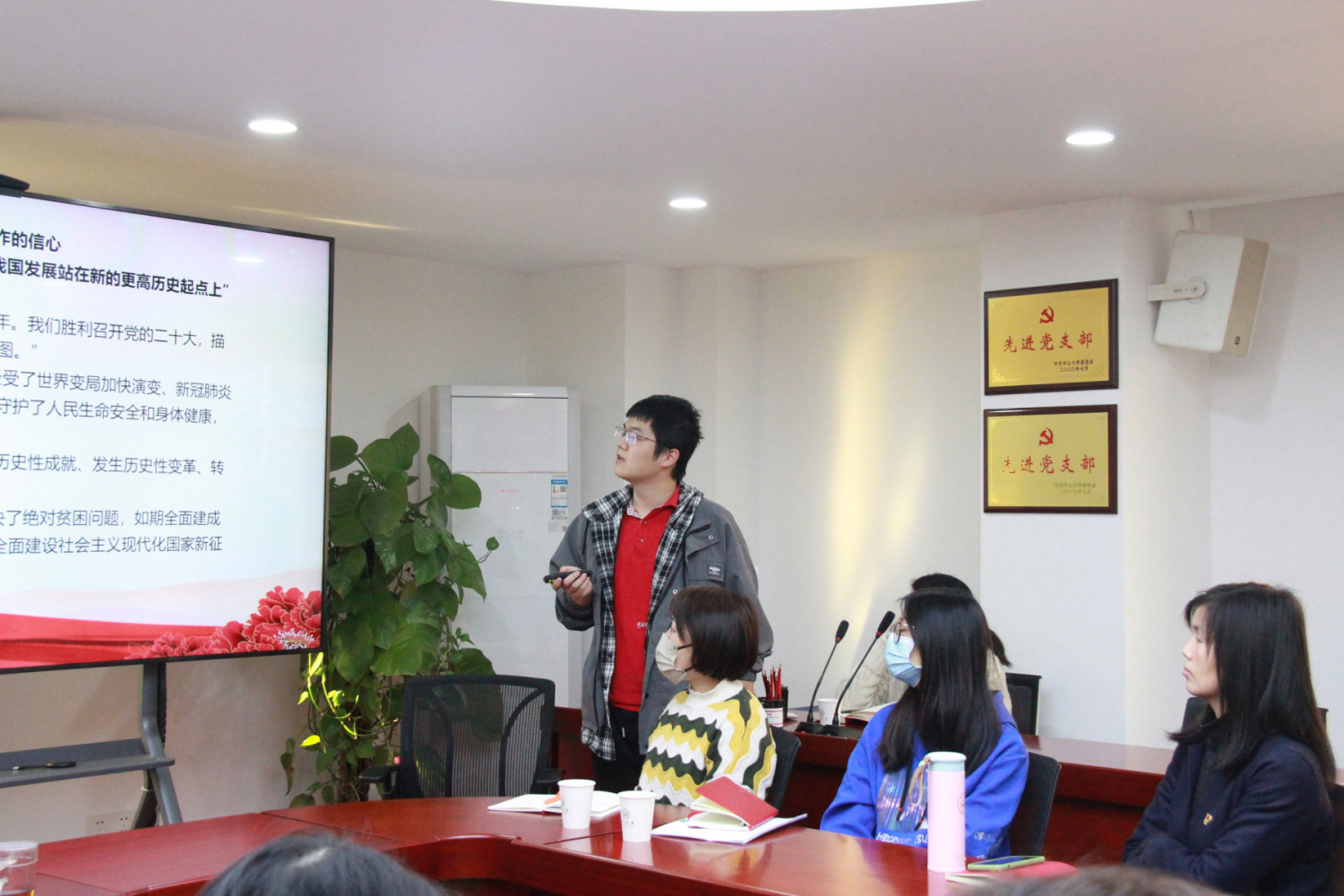 在五位同志完成领学分享后,其他党员纷纷进行热烈回应,结合理论和实践分享自己的学习体会。李林同志首先表达了对周老师的敬意和感谢,自己作为入党积极分子,希望向更多党员同志学习,学习大家在学院工作中发挥的先锋模范作用,下一步自己会继续加强学习、努力工作,力争取得更大进步。李思莹同志谈到,面对工作上的种种困难,一定要勇敢地去面对,面对各种诱惑,一定要坚定信念,坚守初心使命。针对具体工作,她建议大家要做好工作计划和总结,在这个基础上不断细化,久久为功。