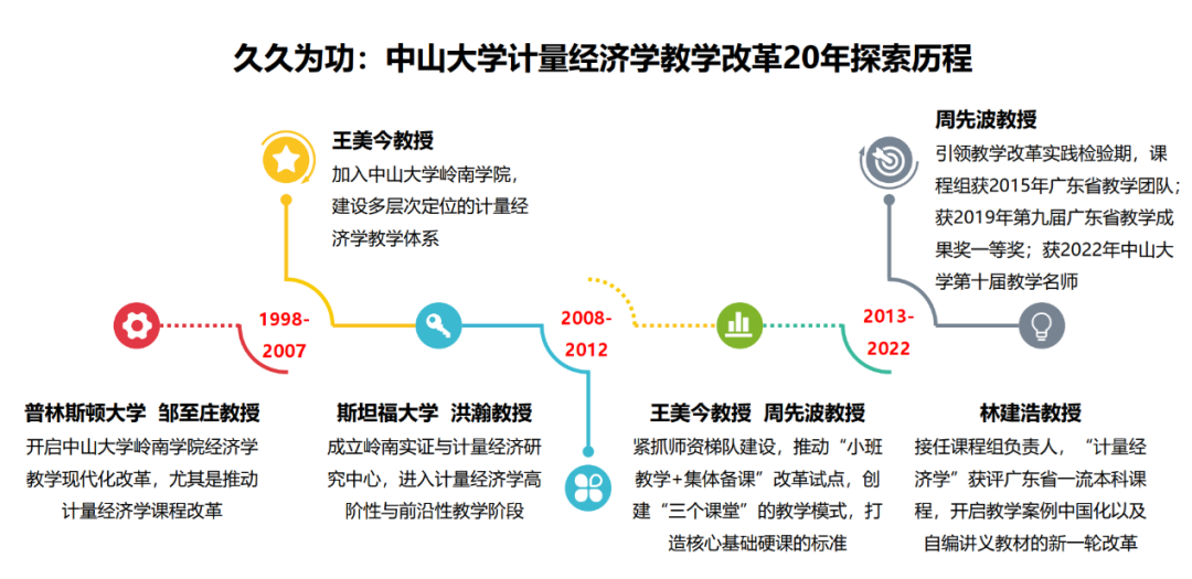 教学团队充分发挥教学名师的“领头羊”作用,重视梯队建设,形成不断探索教学规律的新局面。在享誉全球的计量经济学家邹至庄教授的指导下,岭南学院开启经济学教育现代化改革;王美今教授加入yl9193永利集团之后,主持建设了多层次定位的计量经济学教学体系;斯坦福大学洪瀚教授在岭南学院成立实证与计量经济研究中心,推动计量经济学教学迈向高阶性和前沿性;2012年起,王美今教授和周先波教授领衔推动本科计量经济学的“小班教学+集体备课”改革试点,历经十年打磨建立起基础硬课的标准化模式;林建浩教授接任课程组负责人后,开启了教学案例中国化以及自编讲义教材的新一轮改革。计量经济学的课程建设离不开所有授课老师和教务老师的辛勤付出与通力协作,李捷瑜、李兵、杨海生、郑昕、徐淑一、王霞等老师为课程建设做出了重要贡献。