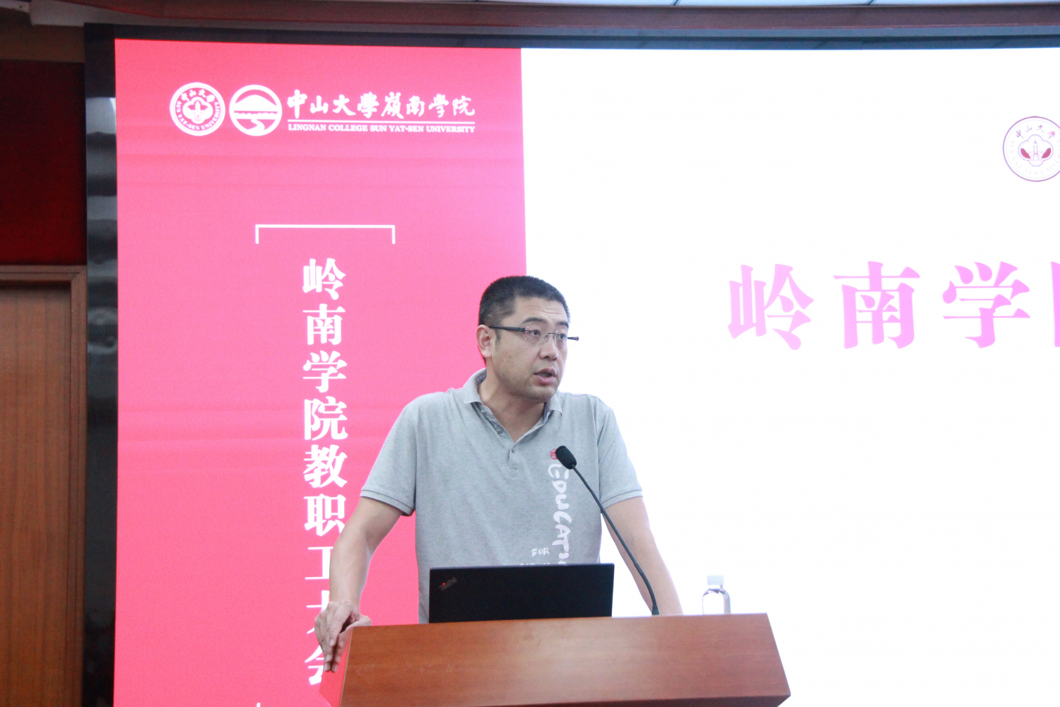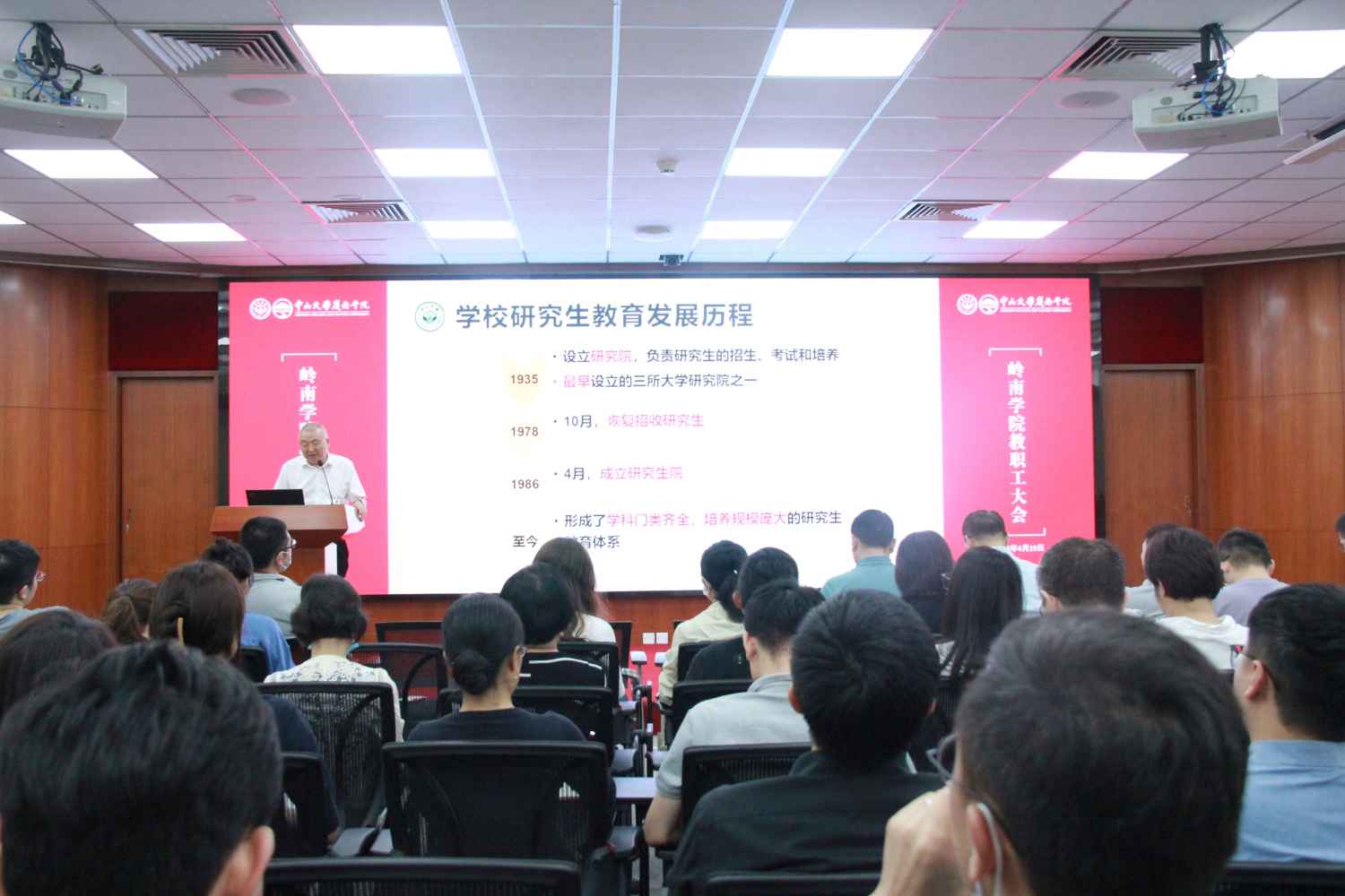 4月19日下午,岭南学院在岭南堂3楼陈荣捷讲学厅召开全院教职工大会,学院院长李善民,党委书记黄毅、副书记樊峰会,副院长鲁晓东、刘彦初、林建浩,院长助理柳建华、郭凯明及学院教职员工共120多人参加了本次会议。会议由学院党委书记黄毅主持。