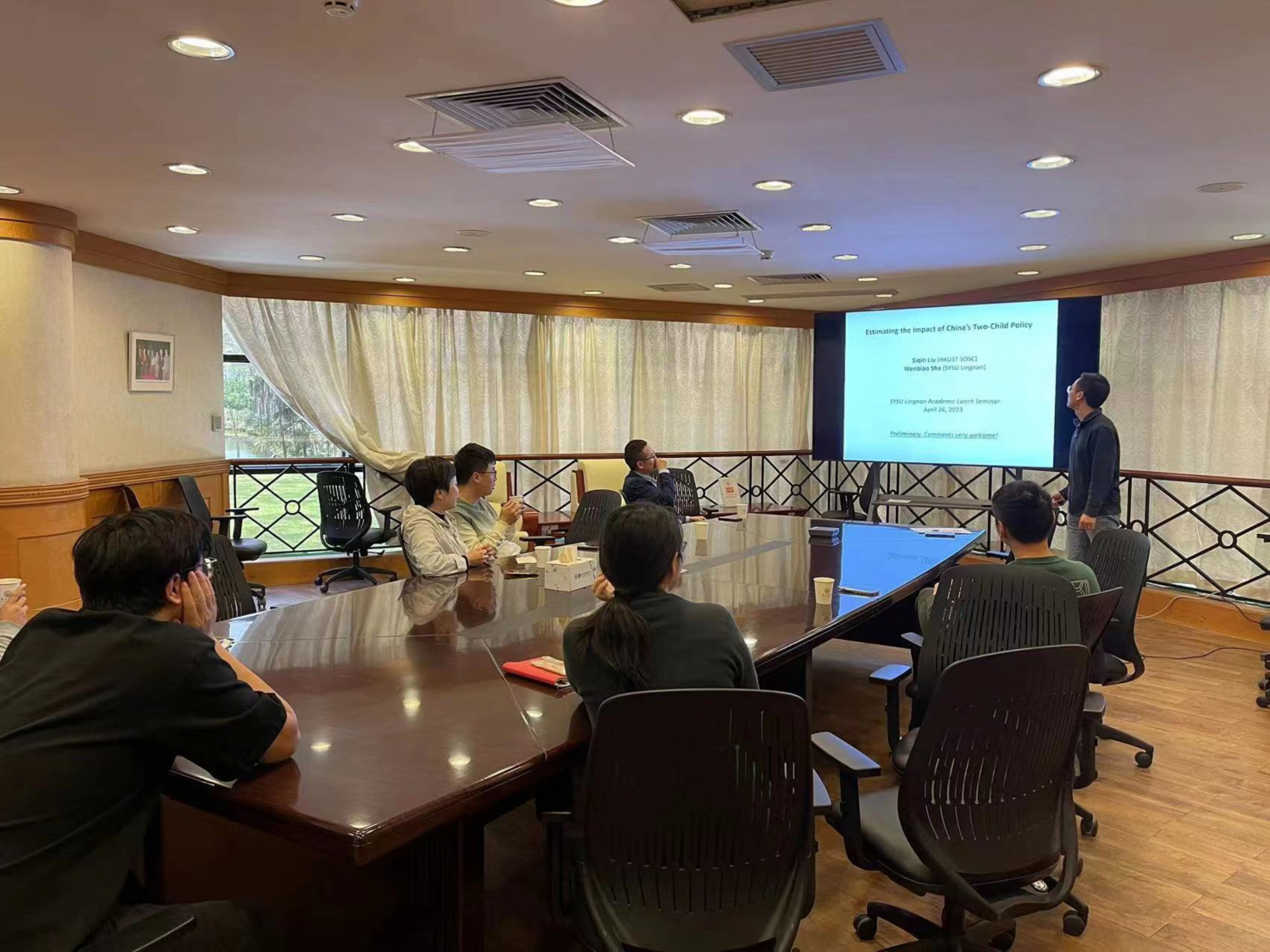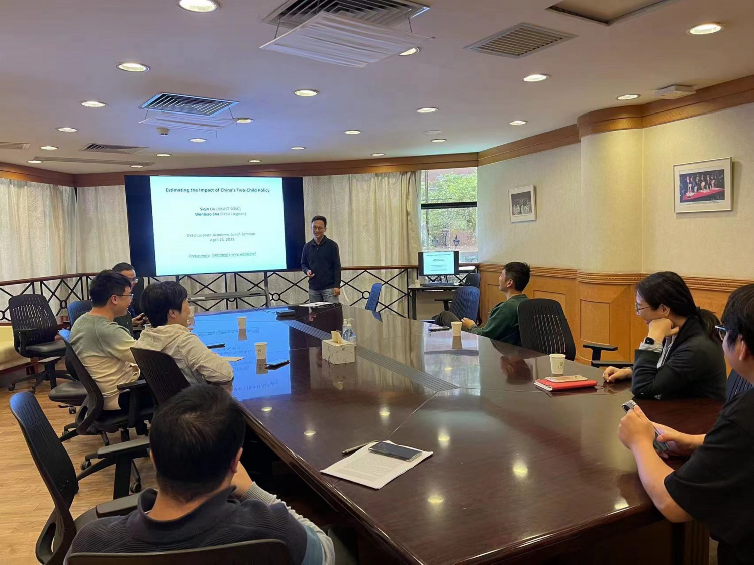 4月26日中午,第三场“岭南学术午餐会”活动在岭南堂一楼林植宣会议室举行,此次活动由学院微观经济与数字经济教研室承办,教研室沙文彪助理教授作为论文汇报人,为大家带来了主题为:“中国二胎政策的影响评估:住房财富的作用(Estimating the Impact of the Two-Child Policy in China: The Role of Housing Wealth)”的论文分享,分享会由学院经济学系主任李兵副教授主持。
