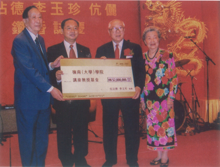 我接触过国内外不少大学,很少看到校友对母校如此深情,他们不论年龄、职业、性别,谈起岭南,谈起白己的级社,那种一往深情,令人羡慕,令人感动。我特别敬佩伍沾德先生和他的哥哥伍舜德先生,认为他俩是岭南校友的杰出代表。他们都是香港重要企业家,他们又全心全意投入岭南复建的事业中。包括伍沾德夫人李玉珍女士和他们的女儿伍淑清女士。26年的历史证明。没有伍沾德就没有今天的岭南,没有校友们师生们一片爱国爱校的真诚就没有岭南故事。