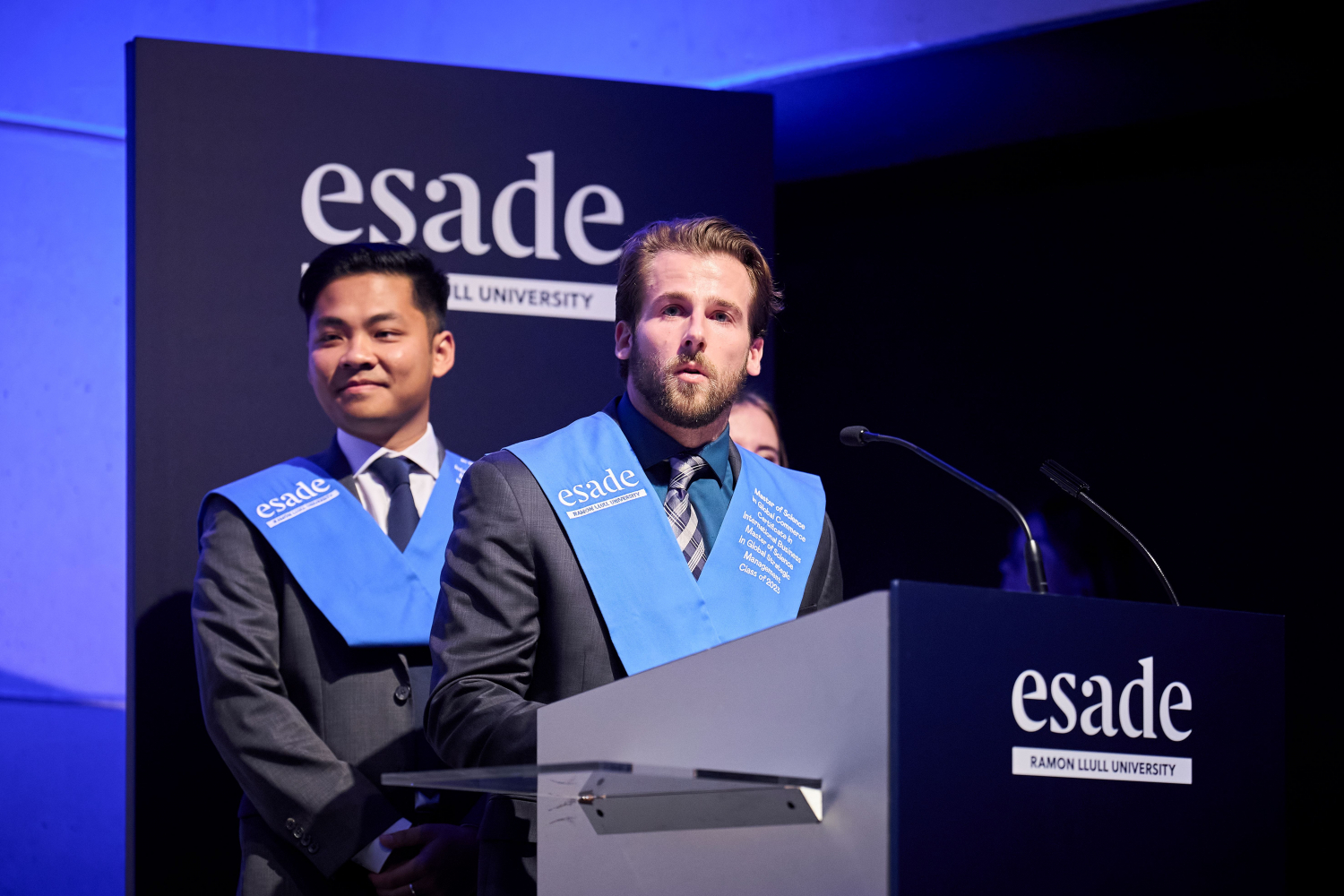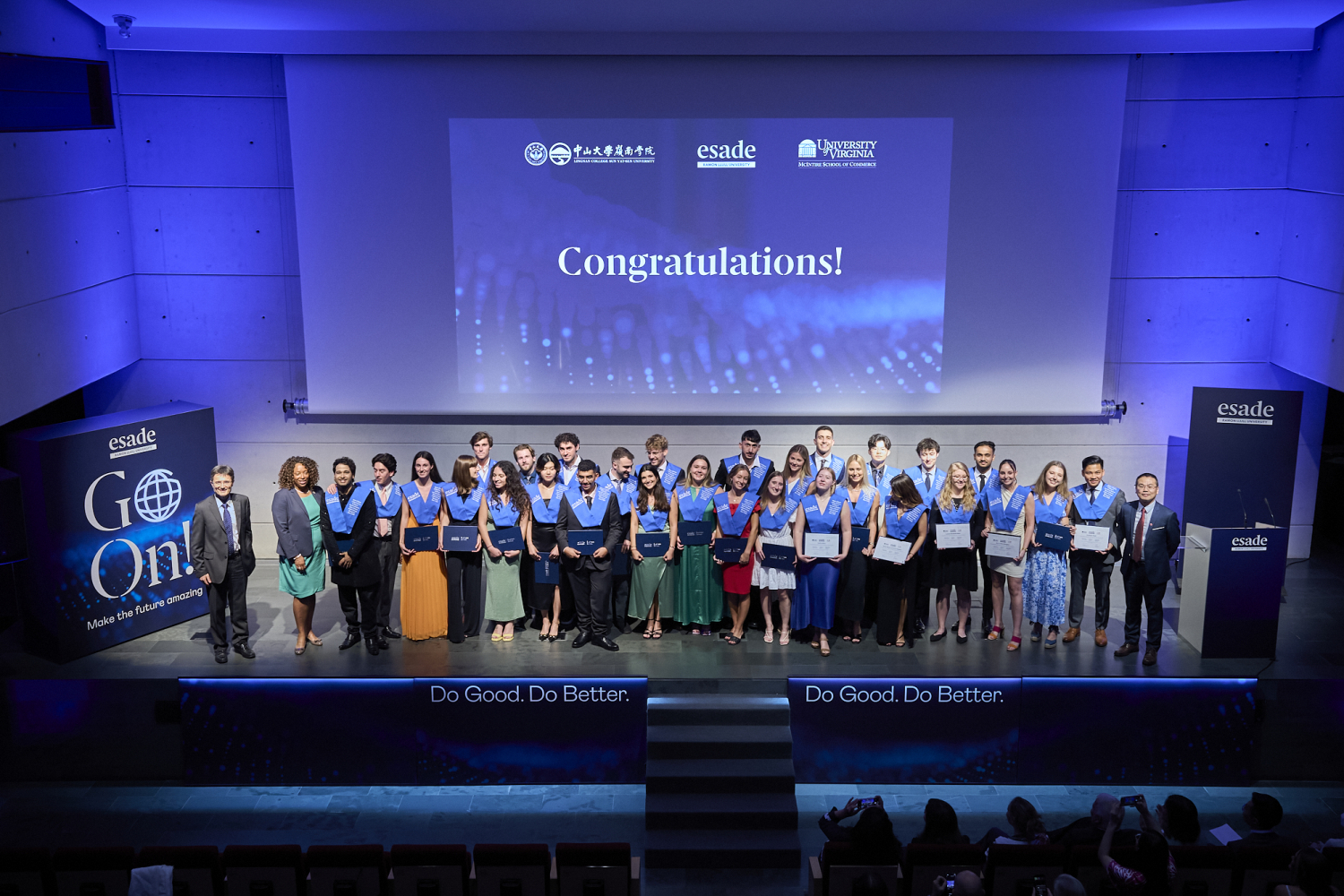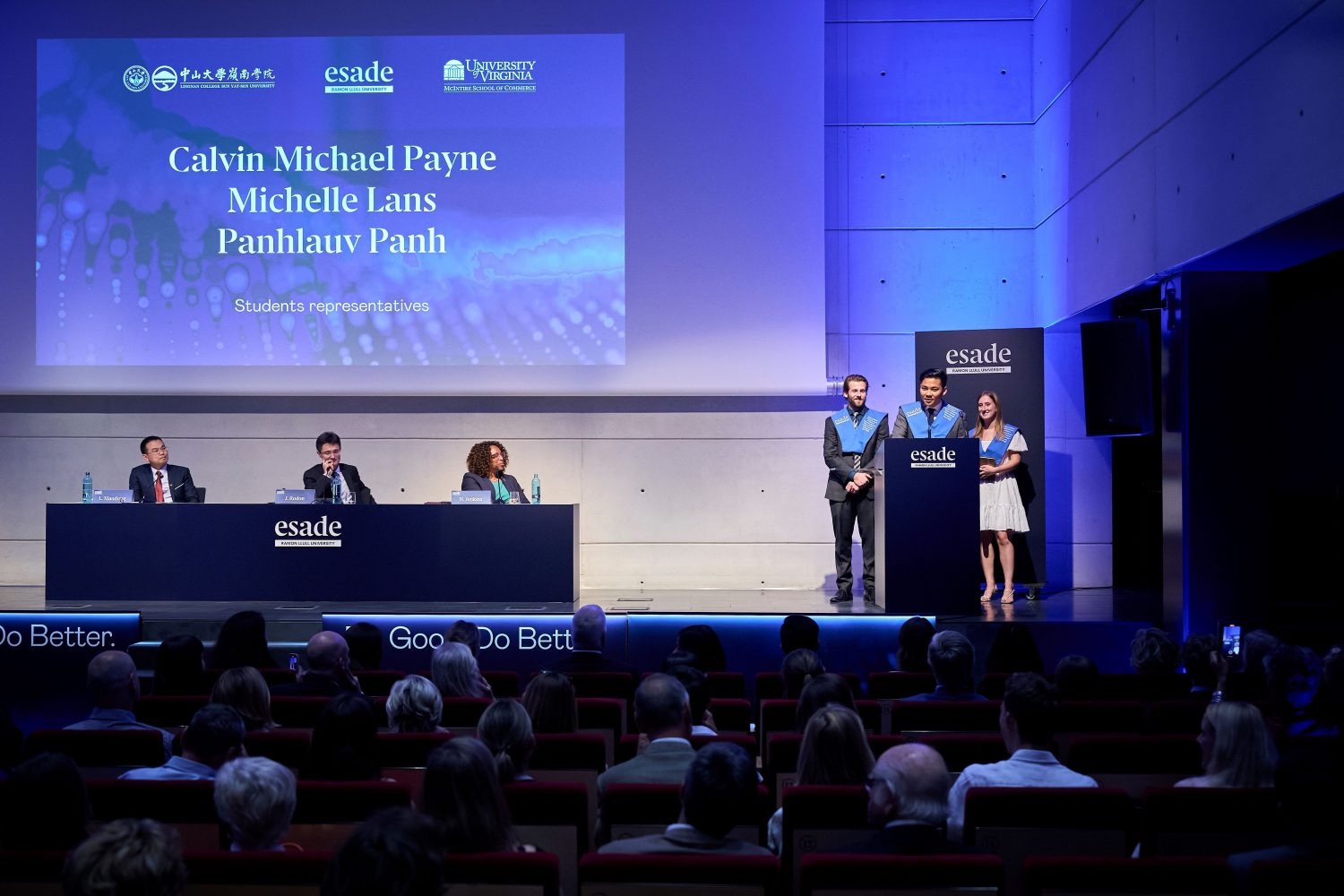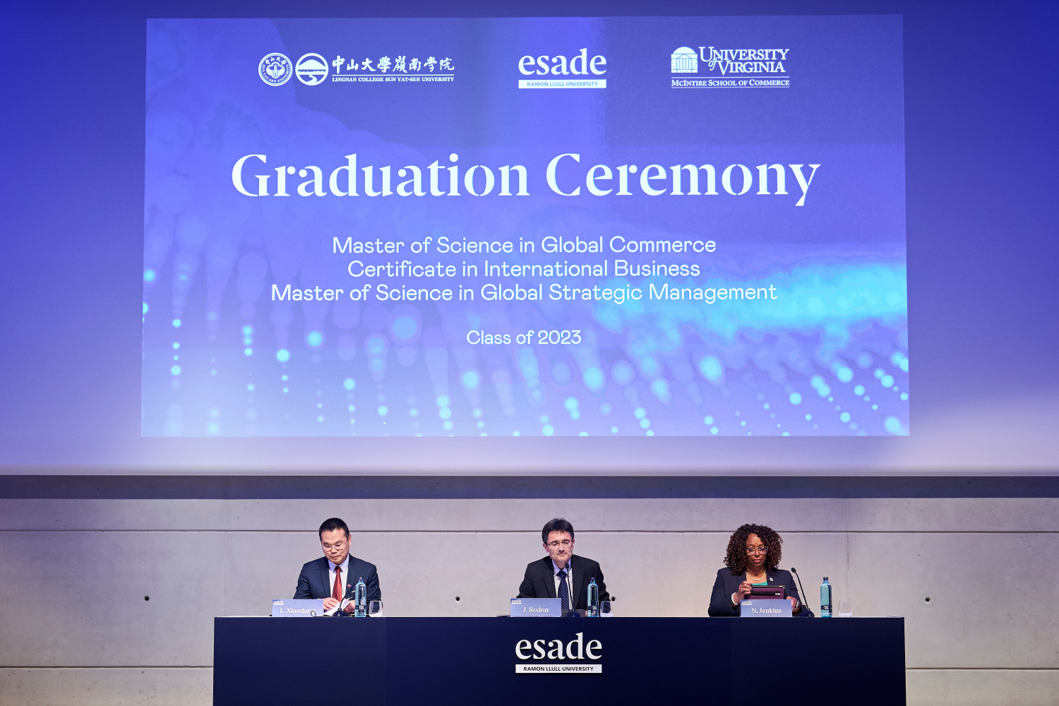 McIntire商学院的Nicole Jenkins院长和ESADE商学院院长Joan Rodon教授也对同学们寄予厚望,希望他们能积极创造属于自己的未来。三国项目毕业生代表在典礼上表达了对三方学校的感谢,对同窗们的不舍之情。
