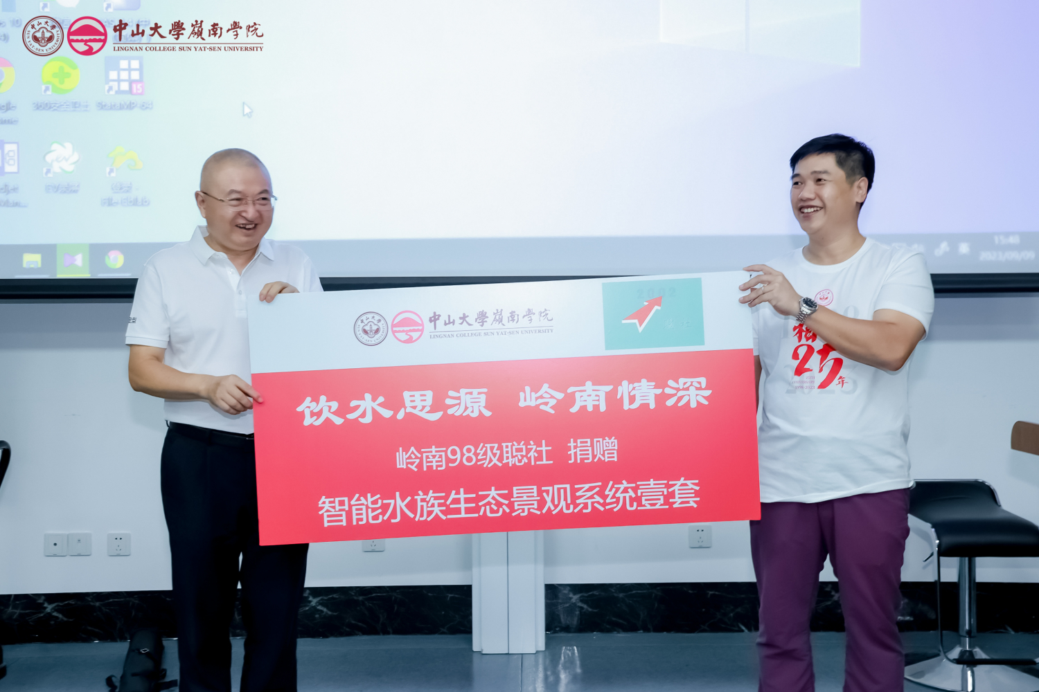 借此返校机会,98级聪社校友向学院捐赠智能水族生态景观系统一套,以表达大家“饮水思源,岭南情深”之意。