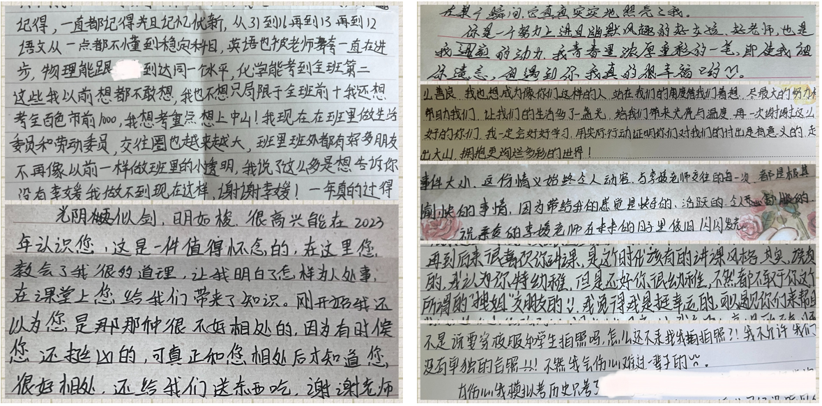 “一秒上课”,是上课前的情绪“脸谱”准备。根据学业基础,她所任教的三个教学班分别属于三个不同层次。三种截然不同的学情也意味着,同样一节课,别人准备一遍的,她需要准备三遍,讲授三遍。无论备课到多晚,批改作业到多晚,筹备活动到多晚,走进教室的那刻起,她总会展现出无比饱满的热情与充足的干劲。2022年12月,学校突发校园疫情,许多教室只剩下零星的在校学生。疫情期间,她始终坚持,只要有一名学生在校,就必须教下去,在学校通知停课放假前,没有缺过一节课时,保质保量完成了教学任务。12月22日冬至当天,还给依然坚持留校学习的学生送上慰问礼物。“李媛老师不仅给我们传播知识,还向我们传递温暖,疫情时的慰问将成为我高中阶段最难忘的事情之一。”