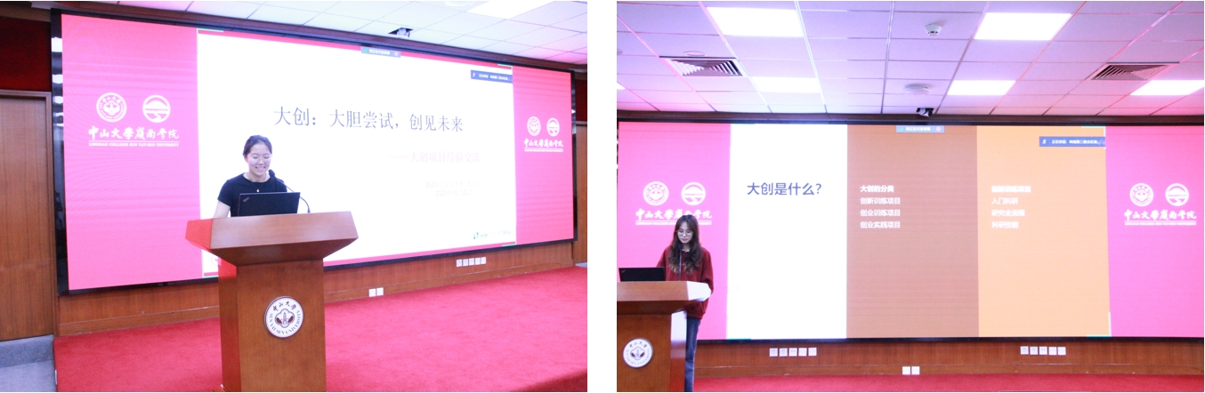 接下来,两位本科学生结合他们参与大创项目的经验进行了个人分享。首先,苏俊元同学围绕着“大胆尝试,创见未来”的主题,分享了自己参与大创的收获。同时,她就组队、选题、时间分配、心态调整等方面给出自己的建议,表示“做到杰出不简单,但迈出第一步并不难”。接着,张丽文同学扫盲式地结合自身经历介绍大创项目的具体流程,加深同学对大创项目的了解。