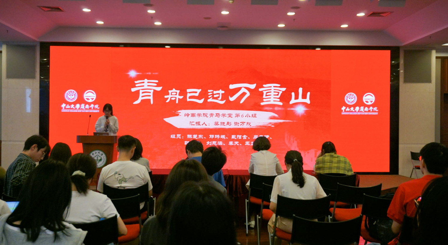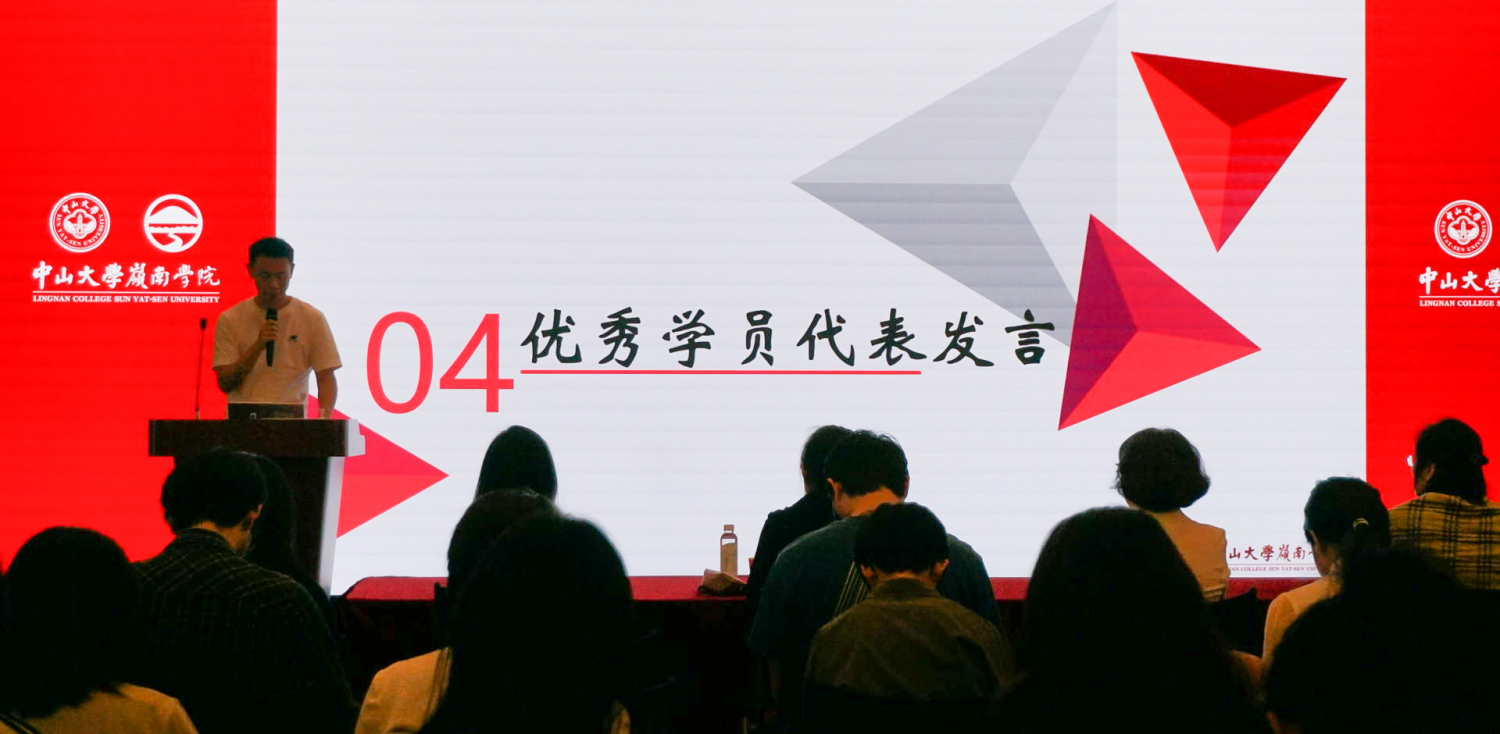 结业仪式由青马班班长李昊东主持,岭南学院党委副书记樊峰会,团委书记、研究生辅导员袁家臻,本科生辅导员于秀丽,党务秘书刘玲琳以及全体青马班学员共同参与本次大会。