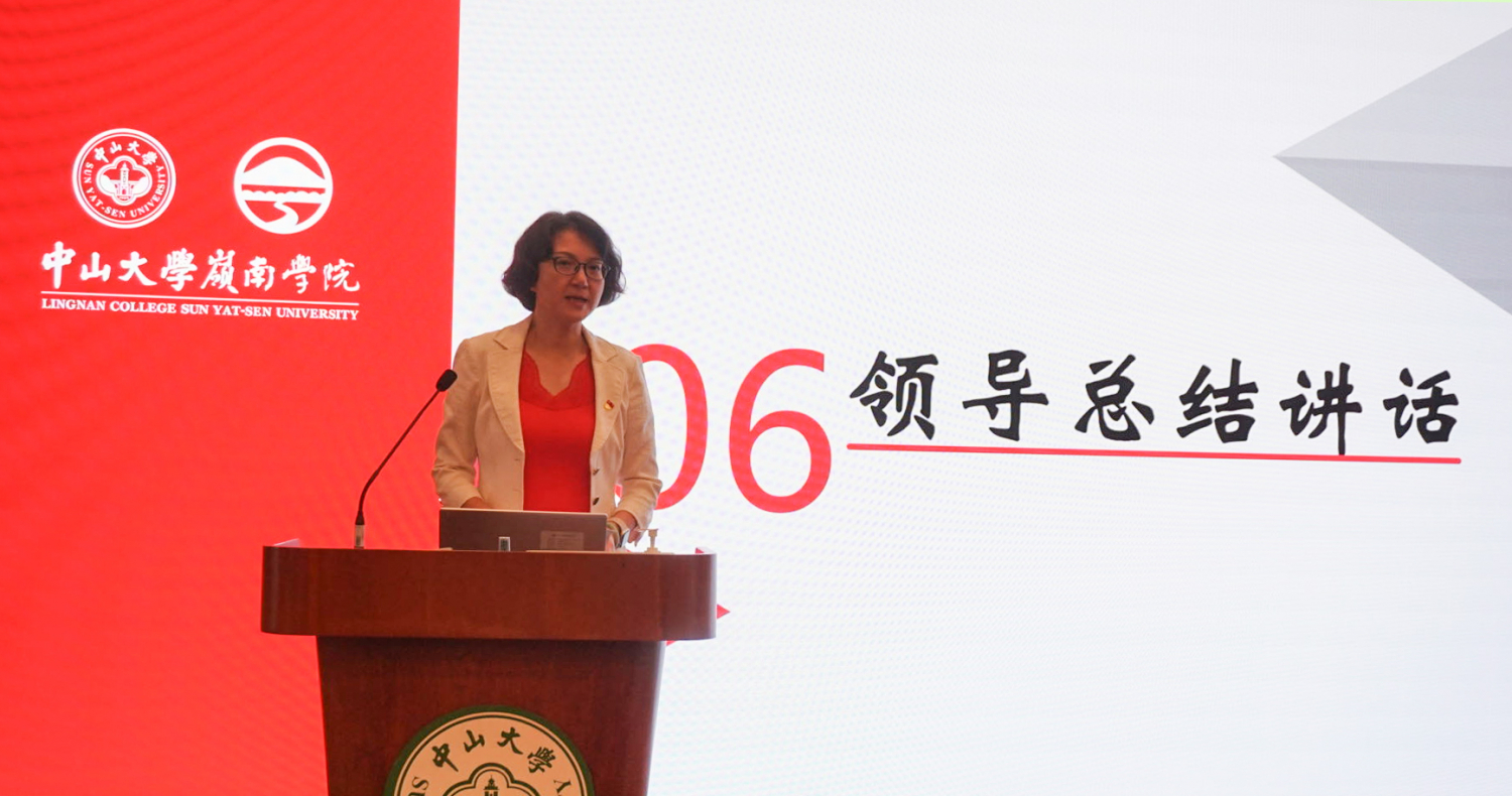 最后,岭南学院党委樊峰会副书记总结讲话。她首先对优秀学员获得者和全体学员顺利结业表示祝贺,表扬了各组学员们的学习汇报,“学习成果丰富,实践经历多样”。她强调学院举办青马班旨在落实团中央的要求,是培养青年政治人才和学生骨干的重要项目,本期青马班“坚持将理论学习摆在首位”、“坚持实践育人、以德为先”、“有序开展工作技能培训”,学员从中收获理论知识、锻炼实践技能,希望学员们能学以致用,在学院各项工作活动中发挥带头作用、展现自我风采;要求学员们继续坚持读原著、学原文、悟原理,坚持多思多想、学深悟透做实;继续加强工作技能学习,在实践中锻炼自我、勇攀高峰;继续关注社会、了解国情,提升自身的社会责任感和使命感,努力成为德智体美劳全面发展、引领未来的时代新人。