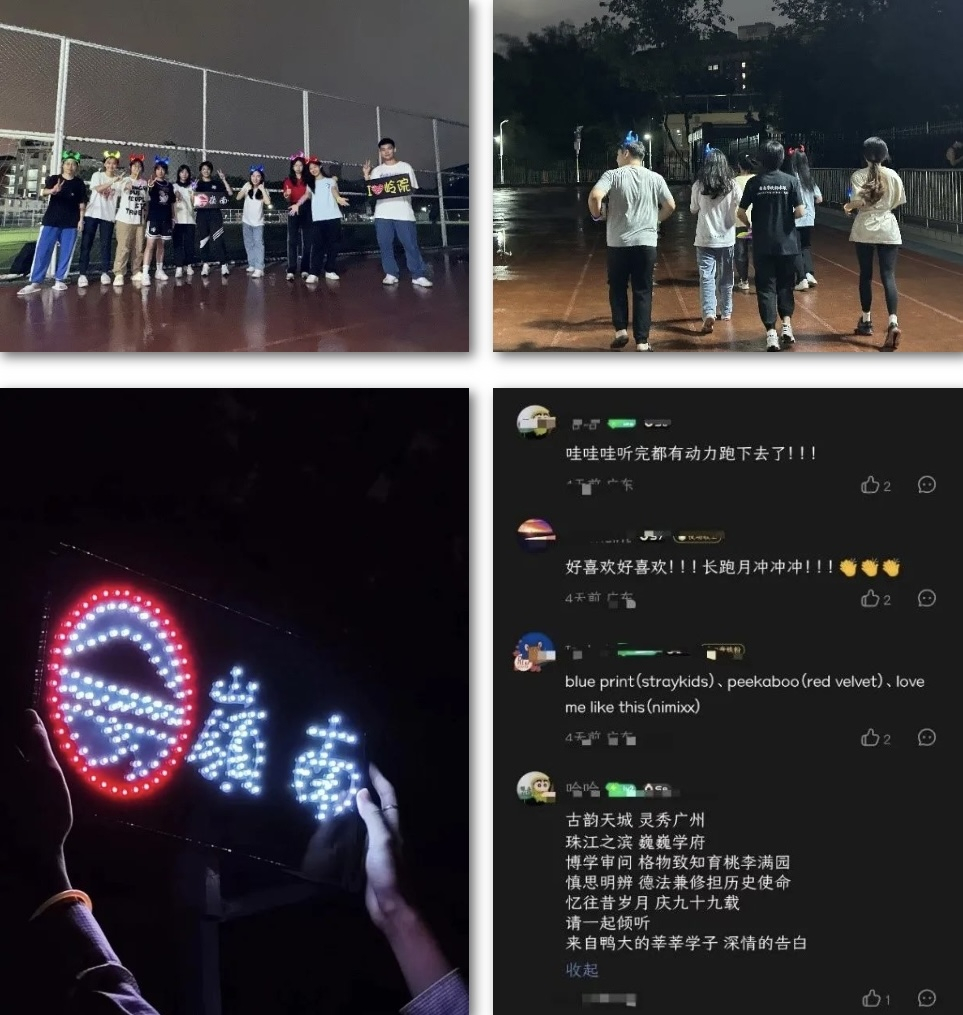 除了现场分发荧光装饰外,我们还在音乐评论区随机送出了五份灯光胸牌,希望广大同学能够保持热情、坚持锻炼,爱运动、爱中大、爱岭院!