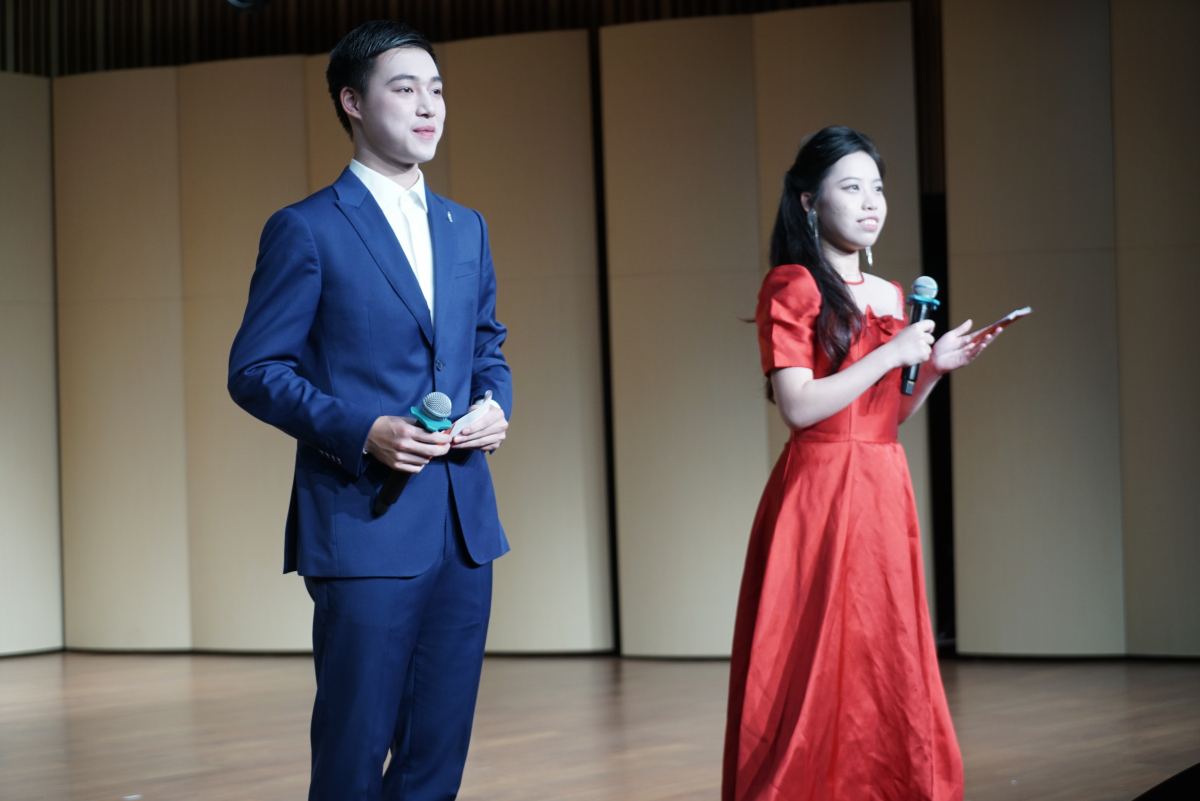 主持人优雅的开场过后,精彩纷呈的节目接续上演,上半场第一个节目室内乐合奏《自由探戈》融合爵士和古典元素,将阿根廷探戈音乐的独特魅力表达地淋漓尽致,让全场观众沉浸在古典音乐的海洋当中。紧接着,岭南学院的梅占峰一首《夏夜最后的烟火》唱出了夏夜时光的美好,勾起人们玫瑰色的回忆。艺术学院19级校友杨子珺演唱了一首《敕勒歌》,让人联想“敕勒川,阴山下,天似穹庐,笼盖四野。”从呼和浩特向西,大青山前,夏季一片深绿,海海漫漫,绵延不绝……再接着是岭南学院的曾浩林与余旻哲带来的原创歌曲《时光谣》,用深情的歌声与钢琴演奏带观众走过时间的长廊。岭南学院吕俊伯演唱了歌曲《若梦》,清欢入梦,对酒当歌。往事随波流转,如今千帆竞发。浮生若梦,为欢几何,日升月落,此生依旧难舍,歌曲表现历史与现实的激荡,带来了不一样的音乐表现力。上半场的压轴表演是艺术学院的室内乐合奏《爱乐之城》,将电影里主人公相识,相知,互相成全,偶然相遇的场景用音乐表达得深情且浪漫。