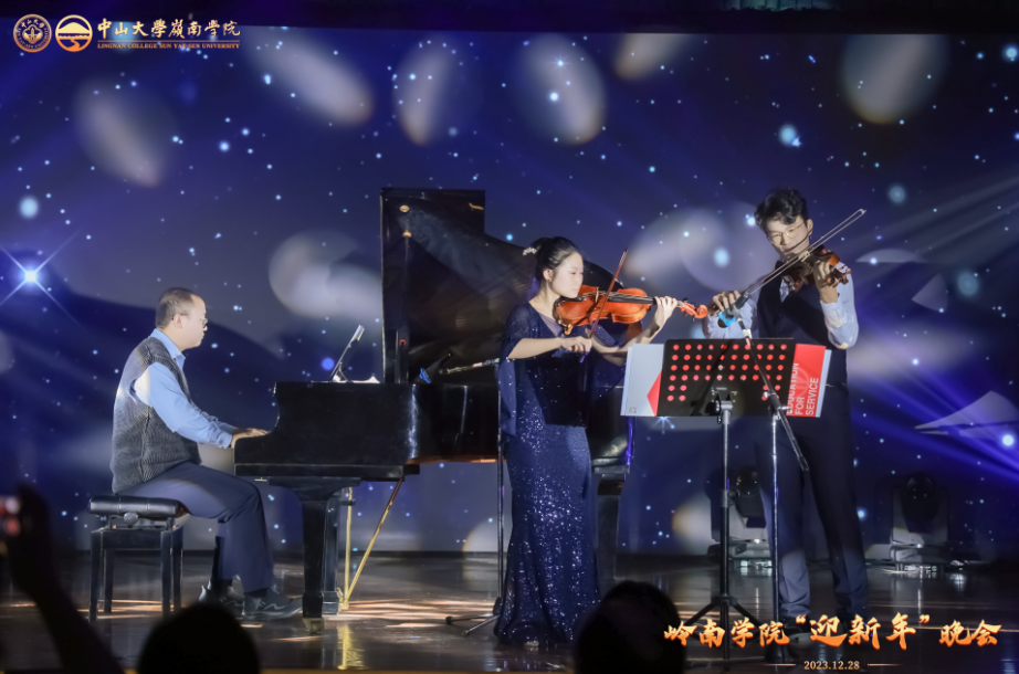 随后,一曲《飘雪》的钢琴、小提琴合奏曲由岭南学院党政办公室主任张硕辰、岭南学院本科生张芃林、管理学院本科生刘晋成激情演绎,勾起了在场观众对曾经岁月的回忆,现场掌声不断,观众情不自禁地跟随旋律摇动身姿,仿佛回到了那个美好的时光。
