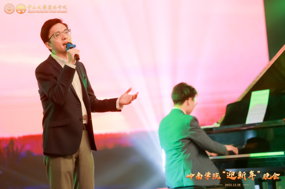 师生合作的表演《狮子山下》展现了岭南学院师生间的默契与合作,李学恒老师的歌声激荡在整个会场,而来自岭南学院2022级的余旻哲同学的钢琴伴奏更是为整个表演增添了一份别样的情感,两者的默契配合让观众沉浸在音乐的美妙旋律之中。