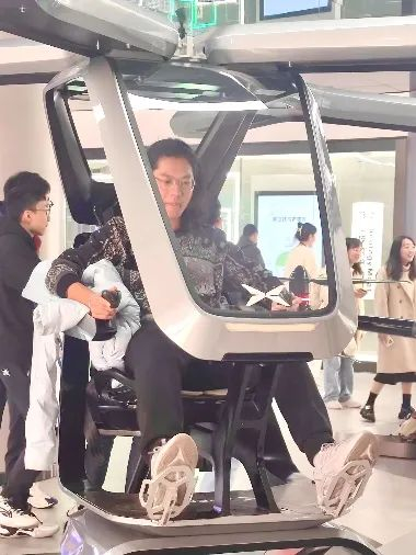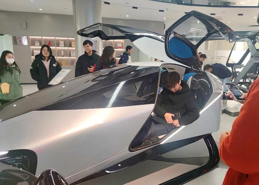 接着,讲解员继续介绍了小鹏汇天飞行汽车的研发与设计。小鹏汇天在创始之初就坚持“核心技术必须自己掌握”的理念,始终在全栈自研的道路上坚定前行,用自主研发构筑“核心技术护城河”。在这一过程中,同学们更加直观地感受到科技、创新是如何赋能企业发展,小鹏汇天的自主研发与创新精神也激发了同学们的向往之情。