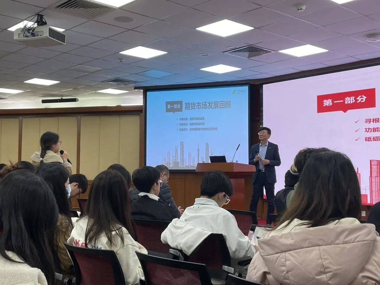 随后,肖成博士聚焦于期货市场的作用,分析其功能特点。期货的两个市场作用——价格发现和风险管理,使得期货在商品和金融市场发挥重要作用。价格发现功能需要有众多的投机者参与,集中大量的市场信息和充沛的流动性,而套期保值交易方式的存在又为风险管理提供了工具和手段。肖博士通过讲解期货的三类投资者——套期保值者、套利交易者和短期交易者,区分期货与赌博、期货市场交易与股票市场交易的本质不同,更清晰地为同学们理清了期货的功能作用及期货市场的运作机制。