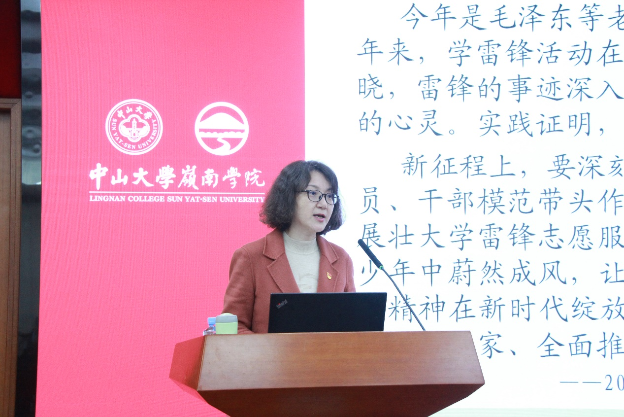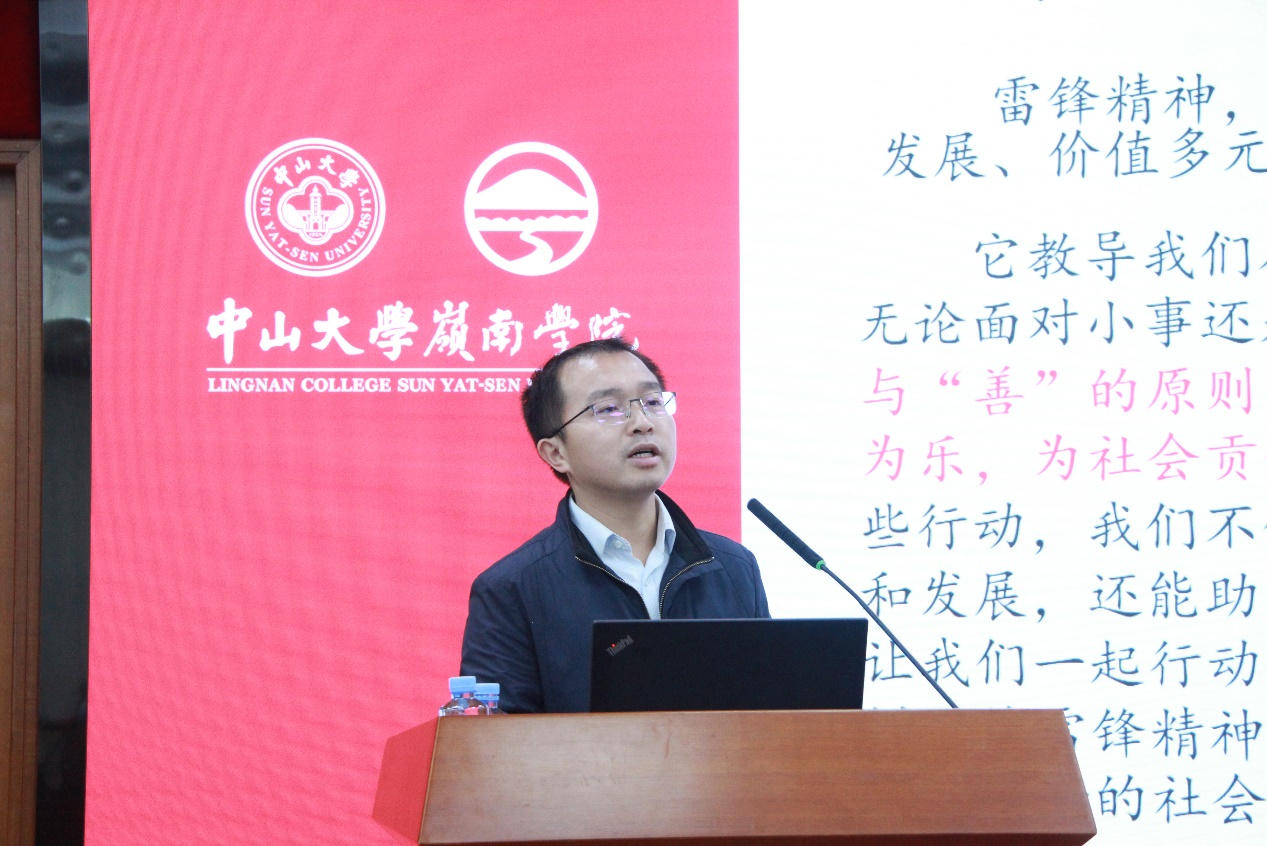 他对深入推动学雷锋志愿活动提出了三点要求:一是强化思想引领,岭院师生要认真学习雷锋同志的光荣事迹,从学习中有所收获,深刻把握雷锋精神的本质和时代内涵;二是真正做到实践,要将“奉献,友爱,互助,进步”的志愿服务精神付诸到实践中,既要学习雷锋的精神,也要学习雷锋的做法,把崇高理想信念和道德品质追求转化为具体行动,体现在平凡的工作生活中,作出自己的贡献;三是发挥先锋模范带头作用,党员、团员以及其他学生骨干要以雷锋为榜样,争做身边人的榜样,做到我为中大做实事、我为岭南做实事,鼓励党支部、学生组织带头举办志愿活动,发挥榜样的示范引领作用,让更多的岭院青年参与到百年校庆、35周年校庆的志愿服务中去,展现中大岭院人的担当。最后,他衷心祝愿每一位岭南青年在学雷锋志愿服务中,在100周年校庆、35周年院庆志愿服务中锻炼本领、感悟使命,早日成为德智体美劳全面发展的社会主义建设者和接班人。