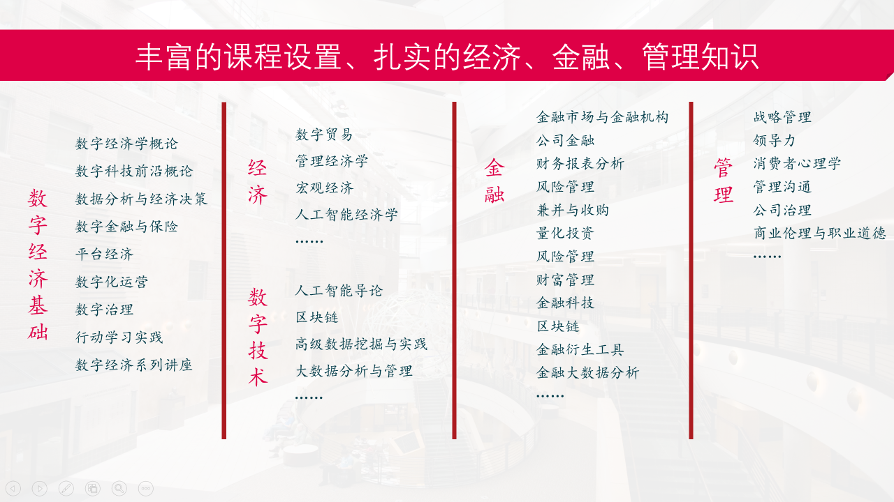数字经济硕士项目旨在培养理论基础扎实、掌握数字技术、具备科学决策能力、具有国际视野的数字经济专业领军人才。这是全国第一个非全日制数字经济硕士项目,更是面向复合型人才的经济+数字技术+金融+管理多学科交叉课程项目。
