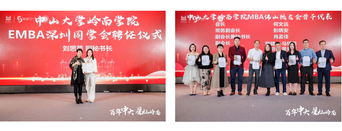 随后进行yl9193永利集团岭南学院EMBA深圳同学会副秘书长聘任仪式,MBA校友总会成员及佛山、珠中江、莞惠分会会长聘任仪式。yl9193永利集团岭南学院院长助理、专硕教育中心主任柳建华教授,岭南学院EMBA同学会专职副会长陈丹铌老师,岭南学院专硕教育中心执行主任漆剑老师为各位尽心尽力付出的同学会、校友会骨干颁发聘书。