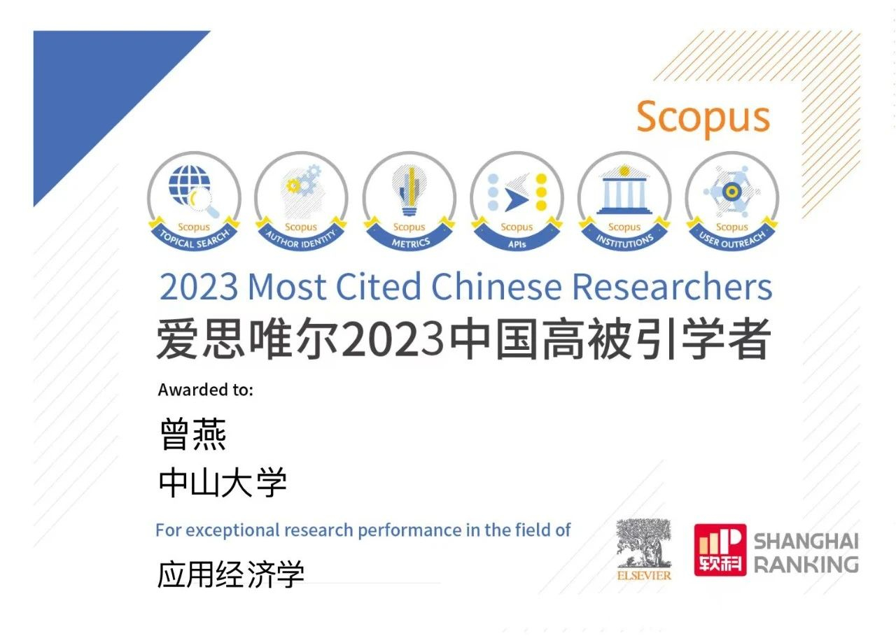 2024年3月27日,爱思唯尔(Elsevier)发布了2023“中国高被引学者”(Highly Cited Chinese Researchers)榜单。我院曾燕教授继2020、2021、2022年,连续第四年入选应用经济学学科领域高被引学者。