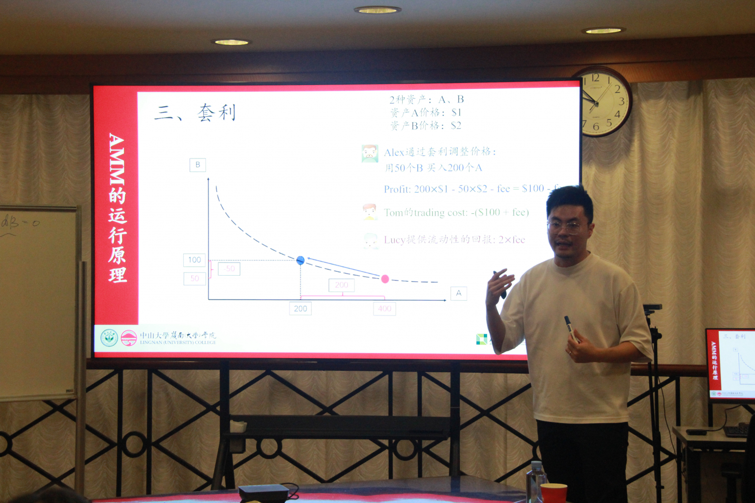 康俊卿副教授从当下的数字金融例子出发,介绍了自动做市商(AMM)的运行原理,其中包含提供流动性、交易和套利及其带来的非永久性损失,之后辩证分析了流动性在自动做市商运行中带来的影响。