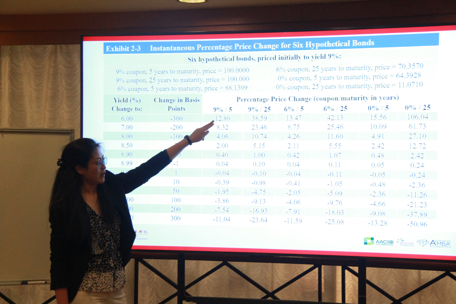 程春丽副教授首先回顾了上节课关于利率风险和无期权债券的价格与需求和市场收益率之间的关系的内容,之后介绍了两种常用的衡量利率风险的指标:基点的价值和久期。