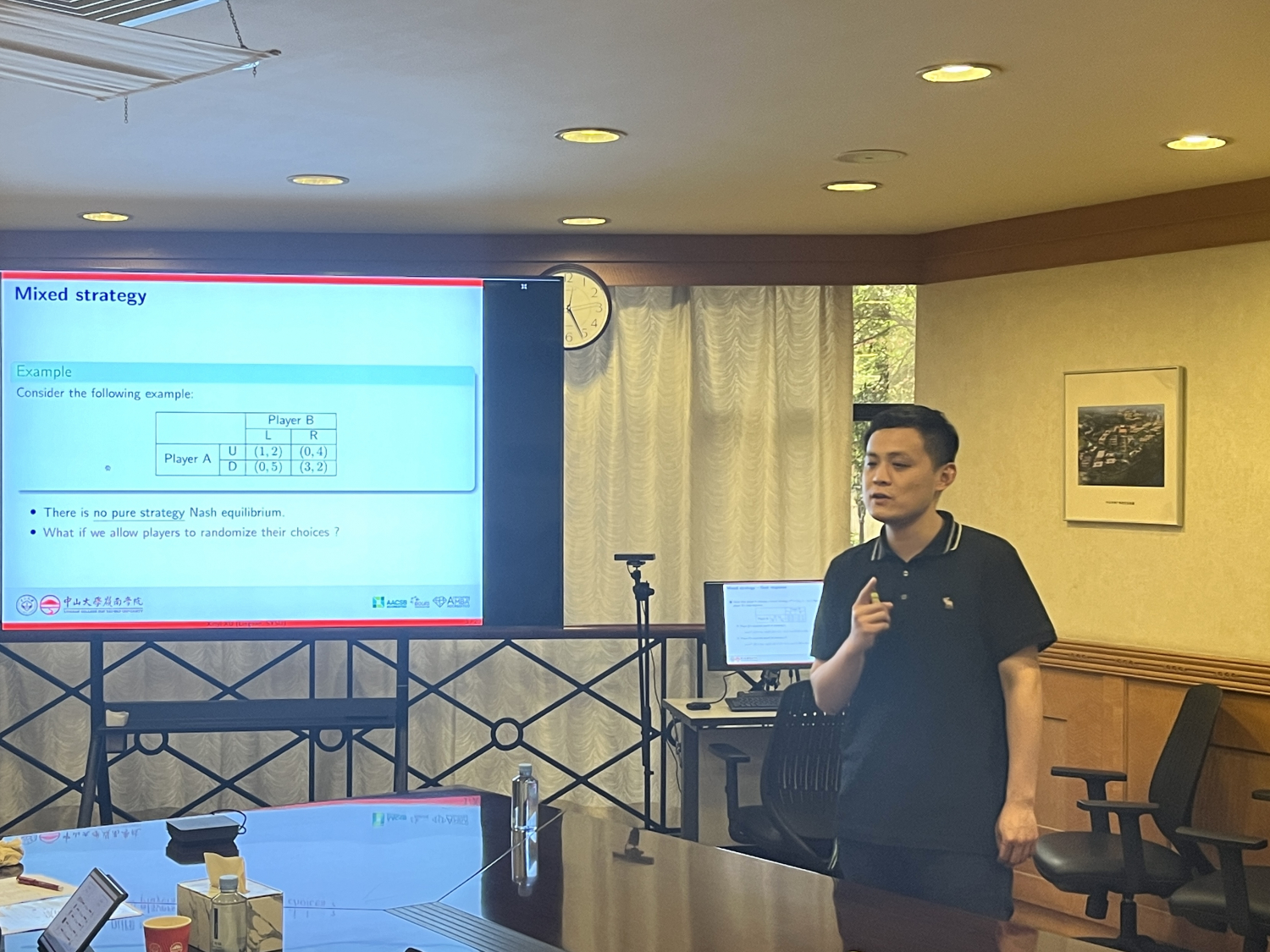 徐欣毅副教授首先利用囚徒困境的例子回顾了纯策略纳什均衡,接着利用收益矩阵通过假定混合策略概率并寻找均衡条件的方法讲解了混合策略纳什均衡的求解,在完成基础讲解后还提供了其他例题方便学生进行实践,并总结归纳了混合策略纳什均衡的定义。