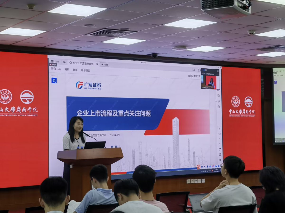 4月15日晚,岭南学院金融高管系列讲座有幸邀请到蒋迪女士,以“企业上市流程及重点关注问题”为主题展开演讲,由岭南学院梁建峰副教授主持。蒋迪女士目前就职于广发证券股份有限公司,担任公司投行业务委员会TMT群组副总经理、总监、保荐代表人,曾参与多家公司的改制辅导及并购重组工作,有着丰富的投行从业经验和资本运作经验。