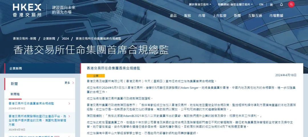 4月18日,香港交易所(00388)官网发布了一则新的委任公告。公告显示,港交所宣布任命成立怡为集团首席合规总监。
