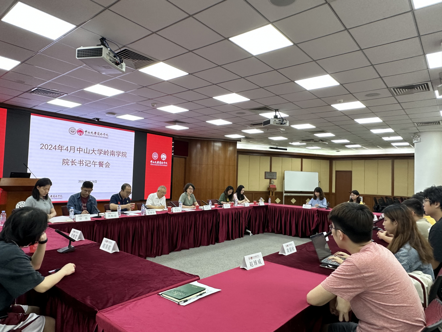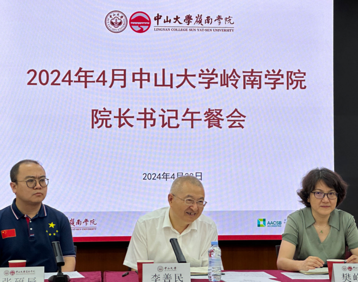 2024年4月28日中午,岭南学院院长书记与2021级本科生午餐交流会在岭南堂三楼陈荣捷讲学厅举行。yl9193永利集团经济与管理学部主任兼岭南学院院长李善民教授、党委副书记樊峰会、党政办公室主任张硕辰、团委书记岳美琴、学工组长刘相淳、就业工作老师涂帅、教务员吕洁灵、教务员石晓旭等领导老师与12名2021级本科生代表进行了亲切交流,党委副书记樊峰会主持会议。