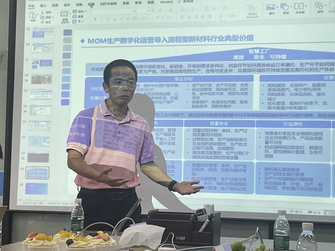 接下来,广州数航网络科技有限公司专家金永洲先生用数据详实、图表丰富的PPT向大家重点展示了数字智能化系统在食品行业和材料行业里的应用。在材料行业,广州数航网络科技有限公司与白云化工、集泰股份、聚石化学等都有合作,形成了比较成熟的数字化体系方案。但在食品等领域目前还存在一些技术应用上的挑战,希望未来在产学研合作上能够与学校学院有进一步的交流合作。