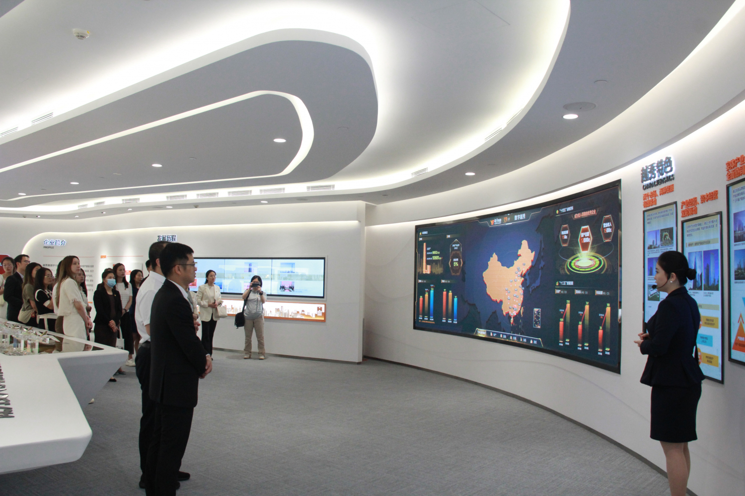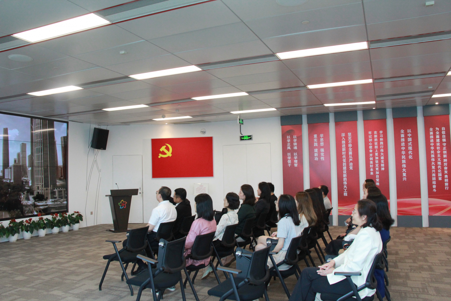 随着大屏的展开,IFC的全隐框玻璃幕墙建筑设计将广州珠江新城的全貌呈现在全体成员面前。讲解员着重介绍了越秀集团旗下的各个产业板块,包括越秀地产、越秀金科、越秀造纸等等,以及发展以来越秀集团形成的四个特色。随后,全体成员来到了越秀集团的党建展厅,越秀集团把增强“四个意识”、坚定“四个自信”、做到“两个维护”贯彻到经营管理和改革发展全过程各方面,认真践行党建“八力”,引领保障集团高质量发展。此外,越秀集团坚持党建引领价值创造,创新基于BSC平衡计分卡的党建管控考核体系,引导基层党组织持续深化党业融合建设。