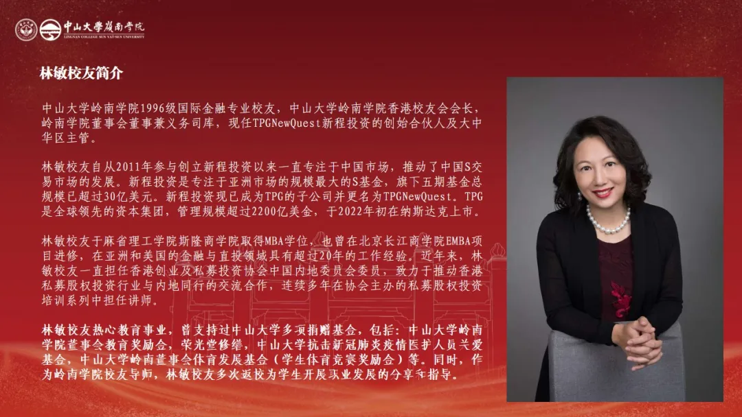 林敏校友于麻省理工学院斯隆商学院取得MBA学位,在亚洲和美国的金融与直投领域具有超过20年的工作经验。近年来,林敏校友一直担任香港创业及私募投资协会中国内地委员会委员,致力于推动香港私募股权投资行业与内地同行的交流合作,连续多年在协会主办的私募股权投资培训系列中担任讲师。