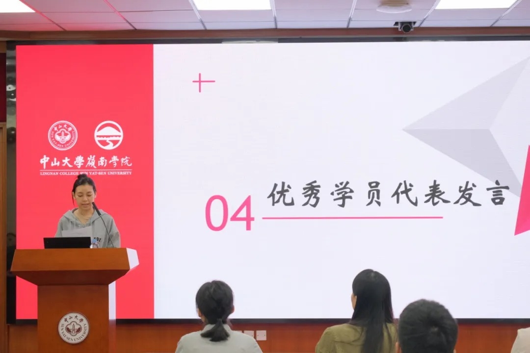 最后,岭南学院党委樊峰会副书记总结讲话。她首先对优秀学员获得者和全体学员顺利结业表示祝贺,她指出,本期青马班坚持将理论学习摆在首位、坚持以德为先,实践育人、开展工作技能培训、首次开设心理健康教育辅导等。学员从中收获理论知识、锻炼实践技能,希望学员们能学以致用,在校内外各项工作活动中发挥带头作用、展现岭南学子风采,努力成为政治素质高、视野格局大、综合能力强、引领未来的时代新人。同时,她希望学院青马班在未来越办越好,既彰显青春活力、又体现岭南特色,成为培养青年政治人才、发挥为党育人政治功能、实现青年人自身价值的重要平台。