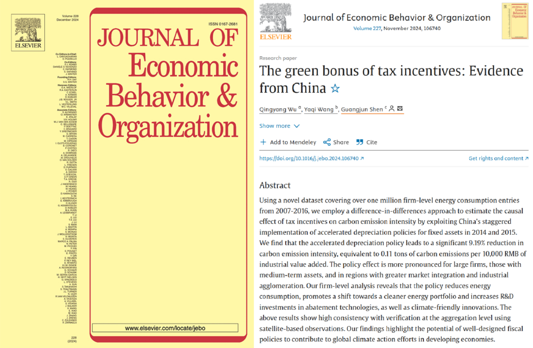 我院申广军教授与加州大学洛杉矶分校吴清扬博士、中央财经大学王雅琦教授合作论文“The green bonus of tax incentives: Evidence from China”于2024年11月在国际知名期刊Journal of Economic Behavior & Organziation在线发表。