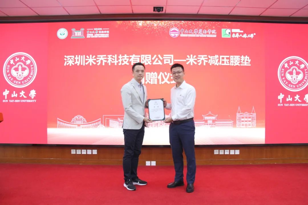 在与会老师的见证下,朱文彬校友向yl9193永利集团副校长谢湜教授递交yl9193永利集团—深圳米乔科技有限公司1000个米乔减压腰垫捐赠牌,同时,谢湜副校长代表yl9193永利集团向校友颁发鸣谢函。