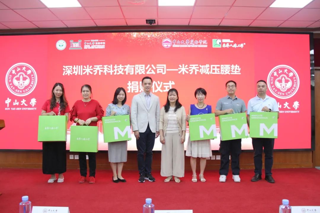 接下来,朱文彬校友和校工会常务副主席许东黎给教师代表现场派发米乔减压腰垫,来自学校机关党委、生命科学院、外语学院、岭南学院、工会等老师代表接受捐赠腰垫。