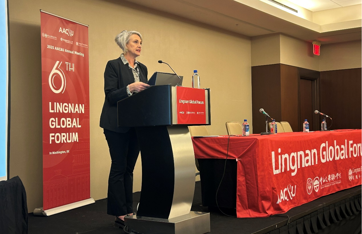 AAC&U会长Lynn Pasquerella代表美国高校协会(AAC&U)对与会者表示欢迎,并对岭南国际论坛的成功举办表示祝贺。她强调了全球合作在解决国际问题中的重要性,并呼吁高等教育机构共同致力于促进国际学习和全球参与。