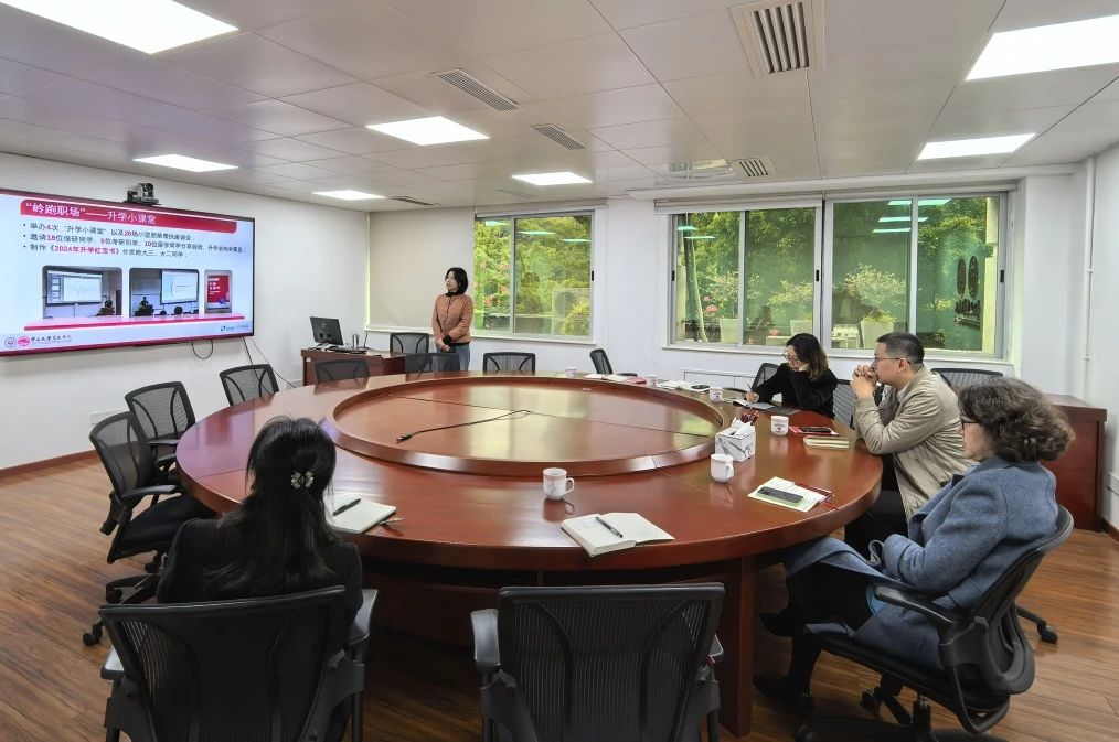 本科就业工作秘书涂帅老师则围绕“一站式”学生社区建设作了汇报。在党委学生工作部的指导支持下,我院在学校“一站式”学生社区设立“岭跑职场”项目,面向各年级同学开展深度指导交流。“岭跑职场”项目设计四项活动,分别为“生涯规划工作坊”“升学小课堂”“职场面对面”与“一对一”咨询。学院“一站式”学生社区建设在学生活动体系构建方面,力求实现服务环节全链条、服务方式全方面、服务学生全覆盖,有利于实现生涯教育和就业指导“更早、更细、更深”。在服务学生成长方面,从学生入学到毕业,贯穿学生培养教育全过程,使学生尽早明晰自己的生涯规划、树立正确的就业观。