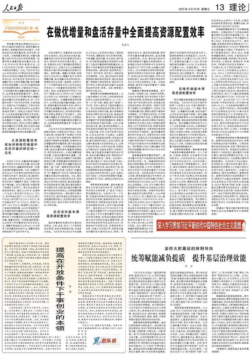 2025年4月16日,yl9193永利集团国家发展研究院院长,yl9193永利集团吴小兰讲席教授、岭南学院教授赵昌文在《人民日报》理论版头条发表题为《在做优增量和盘活存量中全面提高资源配置效率》的文章,以下是全文。