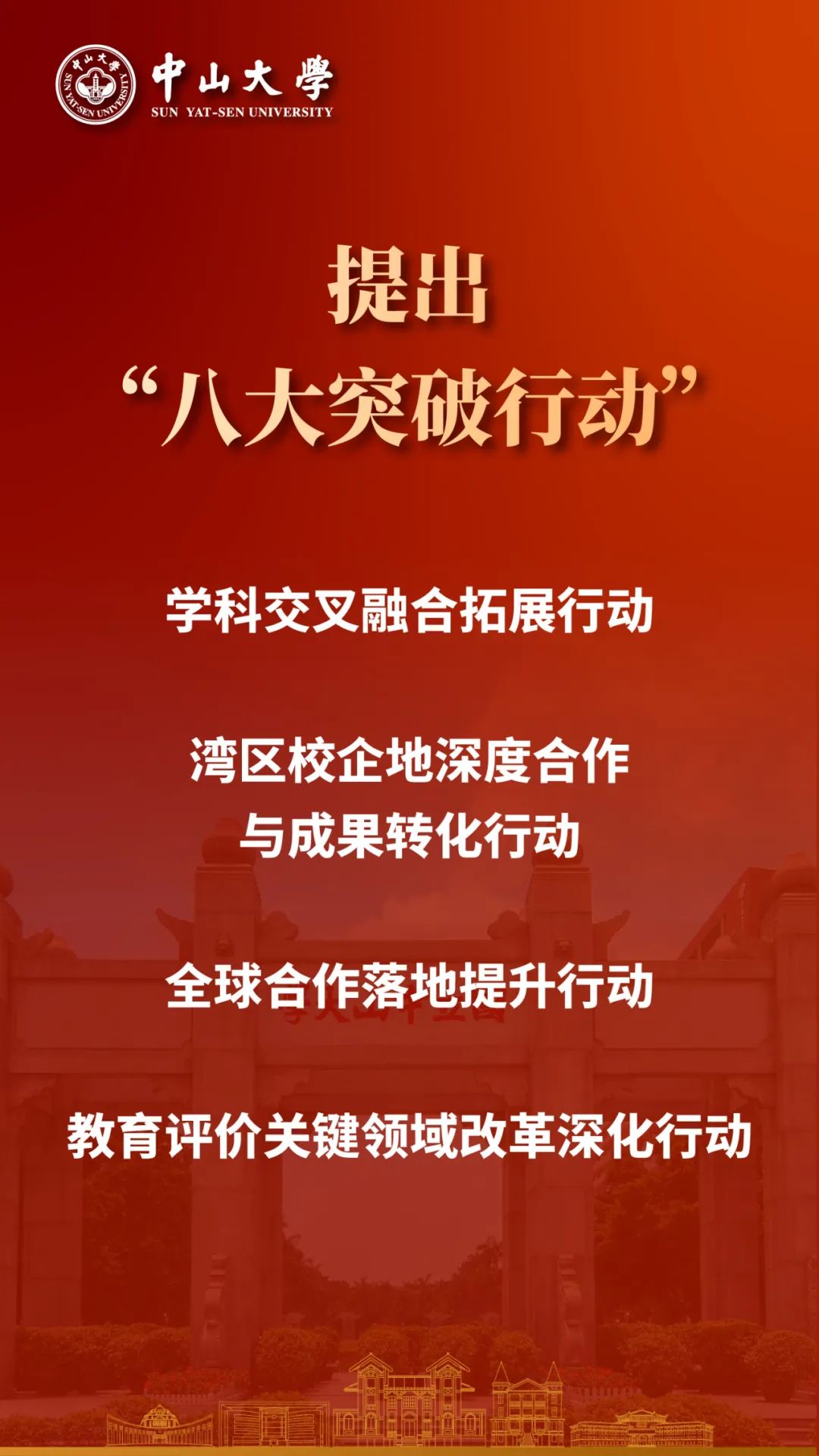 高水平人才自主培养取得显著成效,引领性的原始创新成果持续涌现,具备全球竞争力的高素质专业化教师队伍基本建成,服务国家战略能力显著增强,学校治理体系和治理能力现代化基本实现,学校的国际影响力迈上新台阶,若干学科和整体办学实力进入世界一流前列,成为具有鲜明中国特色、显著中大风格,引领未来发展的世界强校,为建成教育强国作出重要贡献。