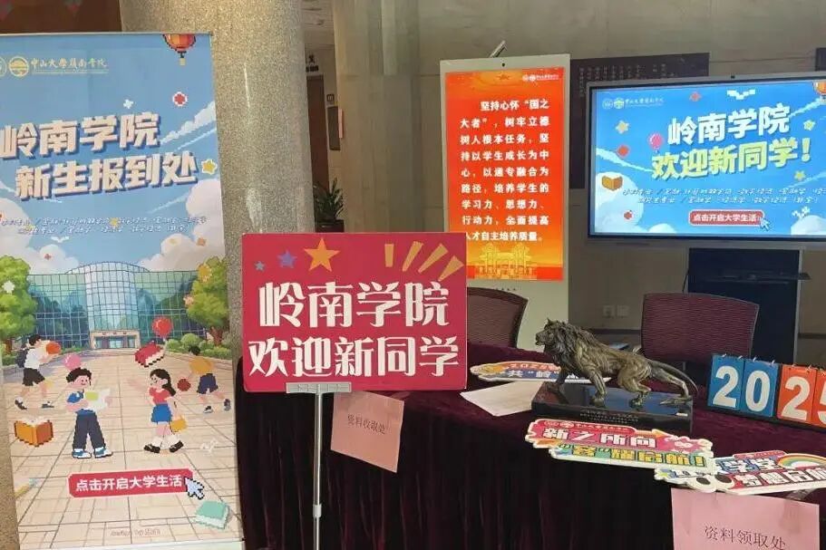 为确保报到工作高效有序,岭南学院提前完成迎新点的布置,在报到点和新生宿舍均摆放了迎新易拉宝,志愿者在新生宿舍门口贴好暖心标语。岭南堂内外,生动特色的欢迎展板吸引了众多新同学驻足打卡。学院合理安排身份核验、扫码报到、领取校卡、签名墙留影等环节,各流程专人负责,同学反馈良好。