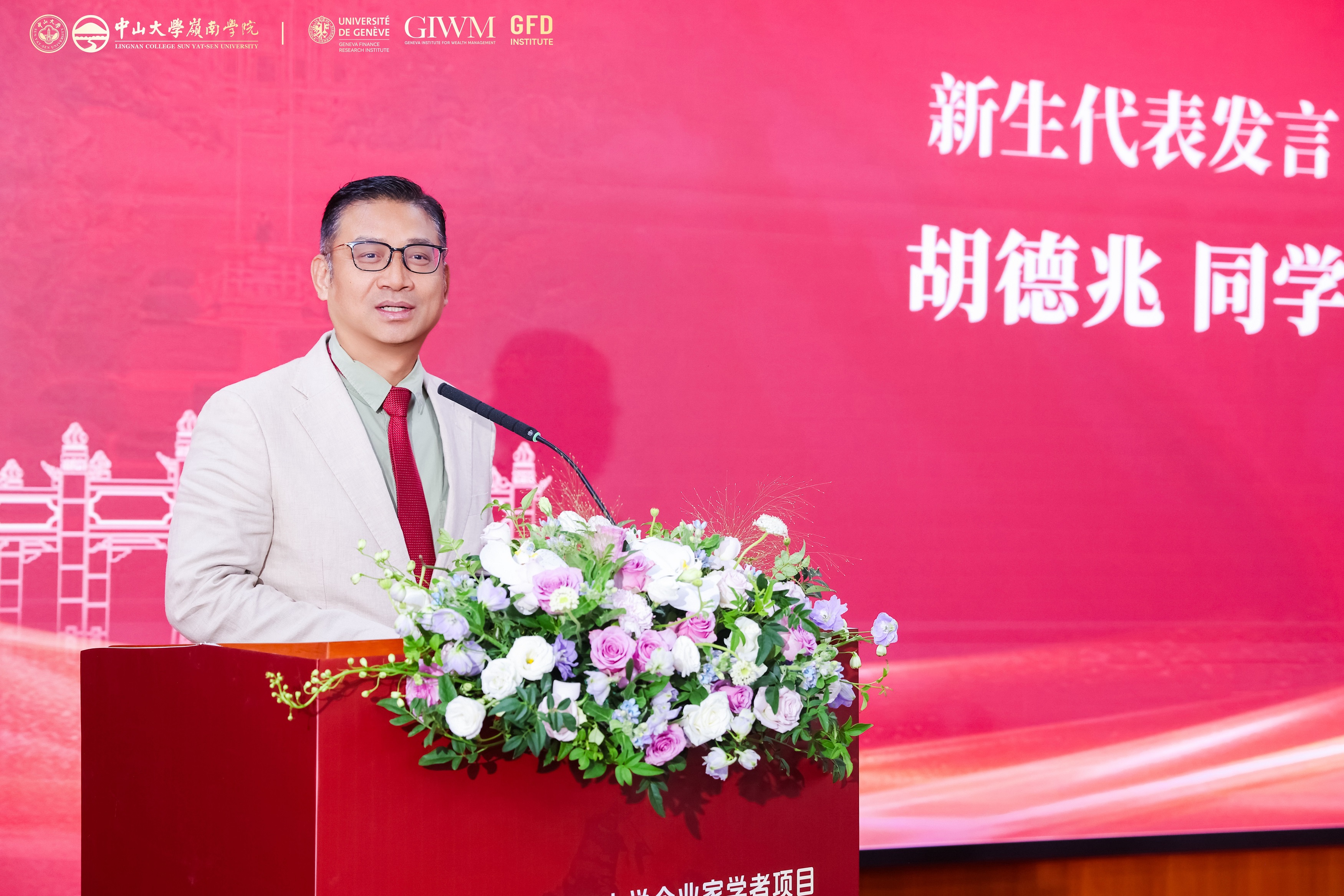 新生代表广州白云电器设备股份有限公司董事长胡德兆同学与宏景科技股份有限公司执行总裁、董事许驰同学在发言中,强调了在金融与科技深度融合背景下继续深造的必要性,并表达了希望通过本项目探索企业新发展的期待。他们倡议同学们保持对学习与生活的热爱,在未来的学习中互相激励、共同成长。