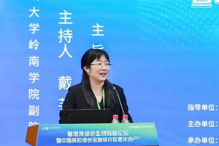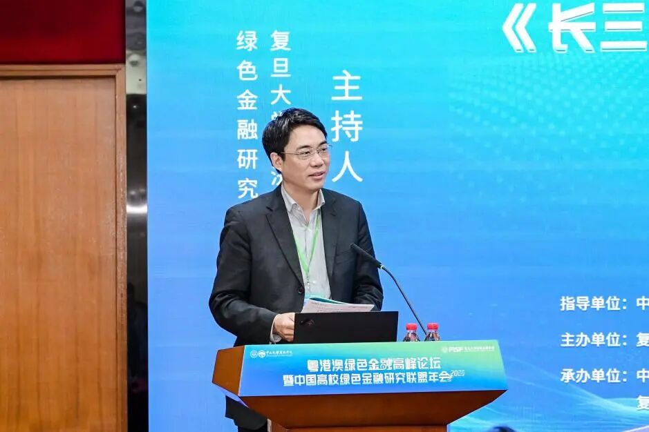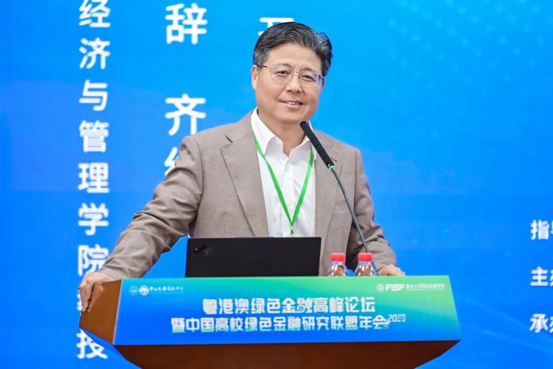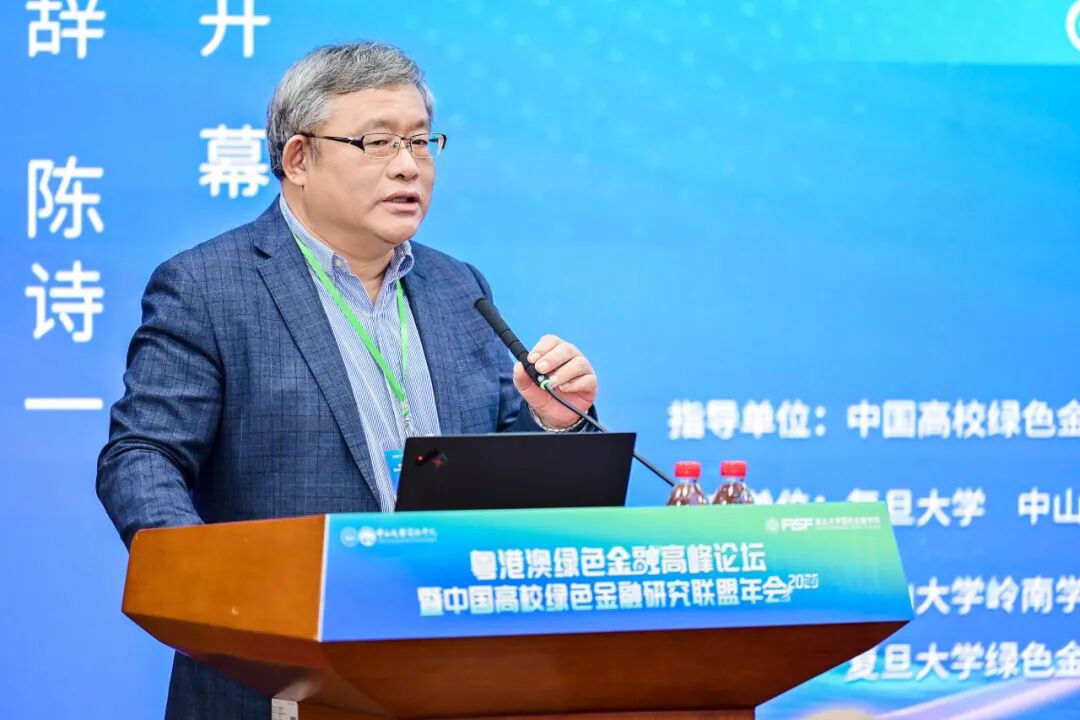 武汉大学齐绍洲教授致辞,他以“远见卓识”“恰如其时”“未来可期”概括本次会议:前者指高校绿色金融联盟蓬勃发展,中者契合“双碳”战略与大湾区发展机遇,后者寄望青年在绿色转型中把握机遇。
