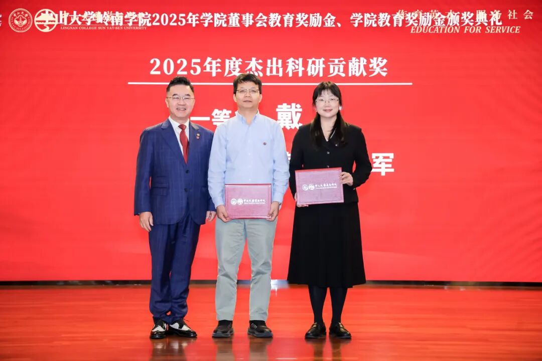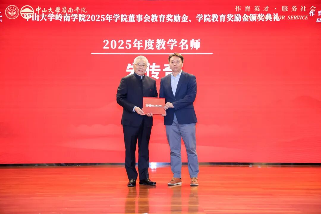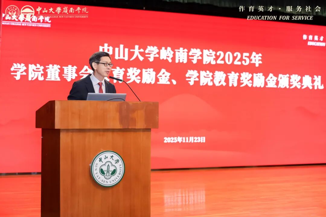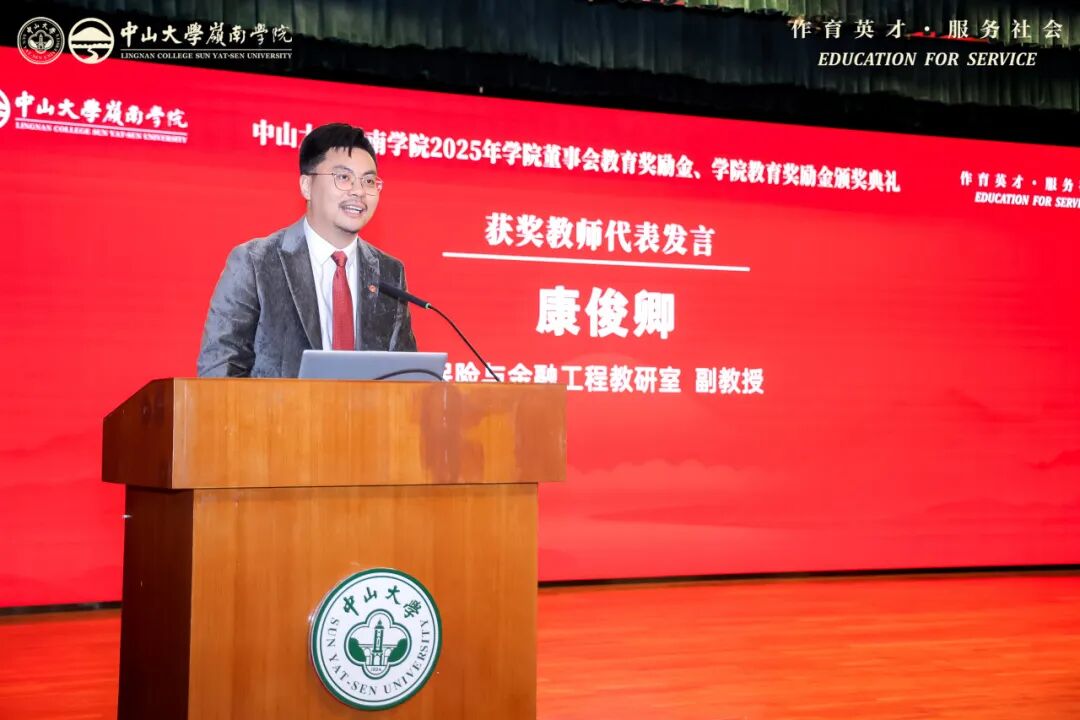 获奖教师代表康俊卿副教授在发言中提到,他既是岭南校友,也是学院教师,感恩学院的培养与各方的支持。他表示,岭南教育扎实前沿且富家国情怀,院训“作育英才,服务社会”是行动指引。他认为教师应做“展示者”,为学生拓展认知边界。面对 AI 时代挑战,他强调人文社科的“压舱石”作用,愿坚守教师本分,传递知识与责任。