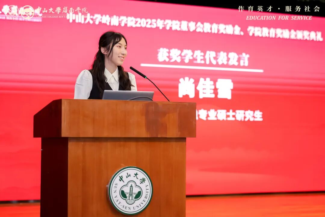 2025级金融专业硕士研究生尚佳雪作为学生代表发言。她在发言中感谢师长与校友支持,坦言受学院“作育英才,服务社会”理念感召,本科时便通过担任学生组织职务践行服务精神,更是在2024年毕业后赴西藏林芝一中支教,让志愿服务落地见效。伍沾德先生曾说“岭南的毕业证书是一生无法偿清的欠单”,她表示将以先生为榜样,秉持“一日岭南人,一生岭南人”信念,以行动传承服务精神,为学院与时代添彩。