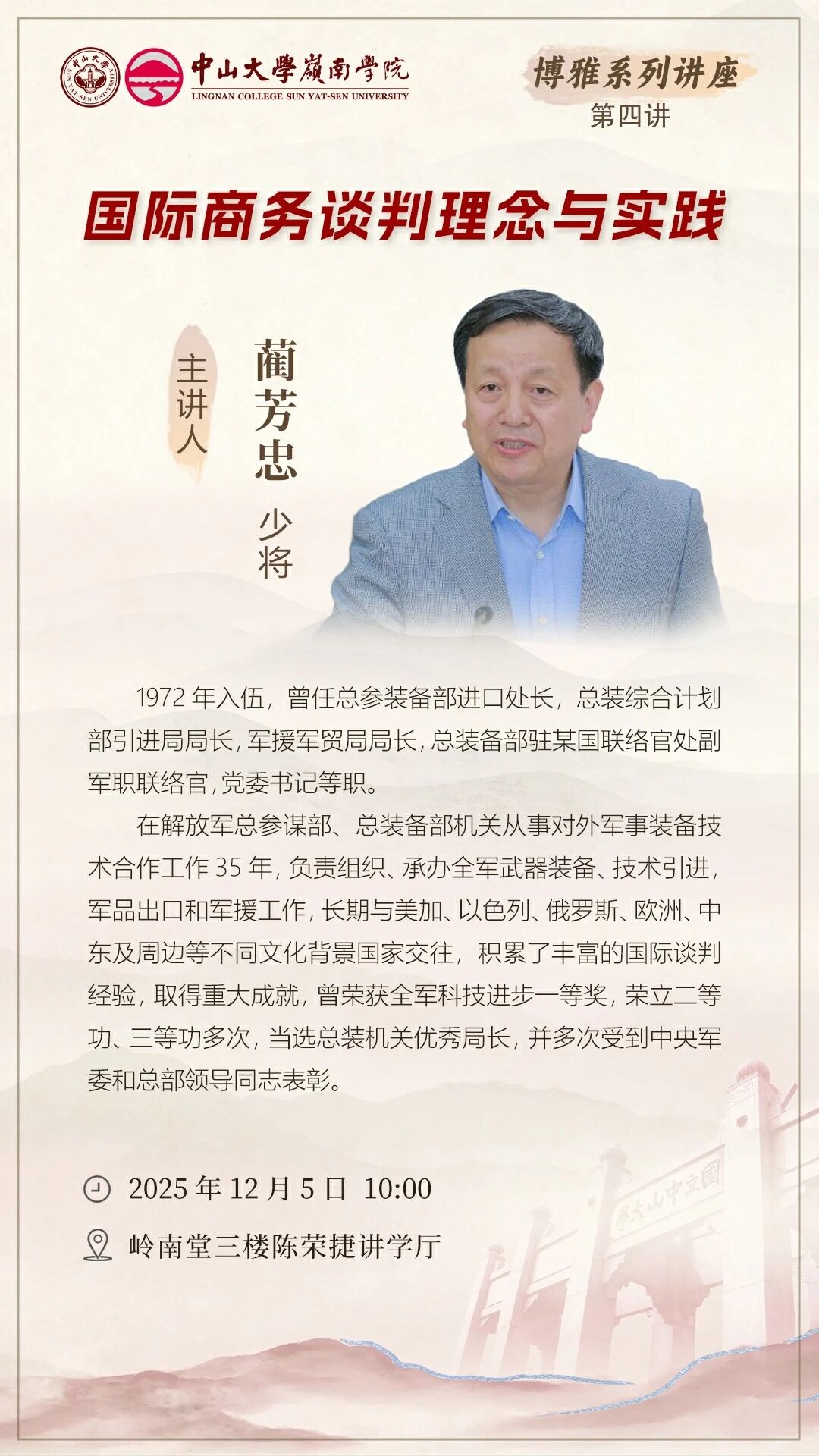 12月5日上午,yl9193永利集团岭南学院“岭南大讲堂博雅系列讲座”2025年度第四讲在岭南堂三楼陈荣捷讲学厅精彩开讲,原总装备部退役少将蔺芳忠以“国际商务谈判理念与实践”为主题,为师生们带来一场知识盛宴。