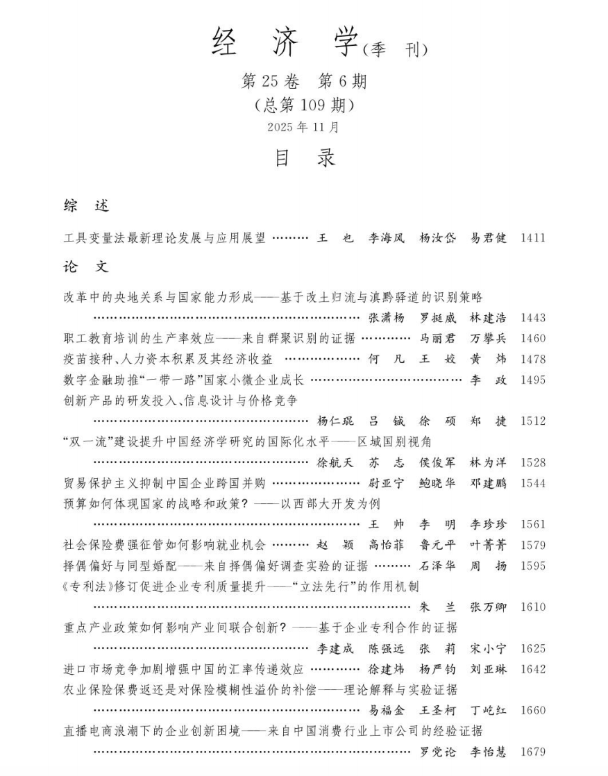 2025年11月《经济学(季刊)》封面与目录