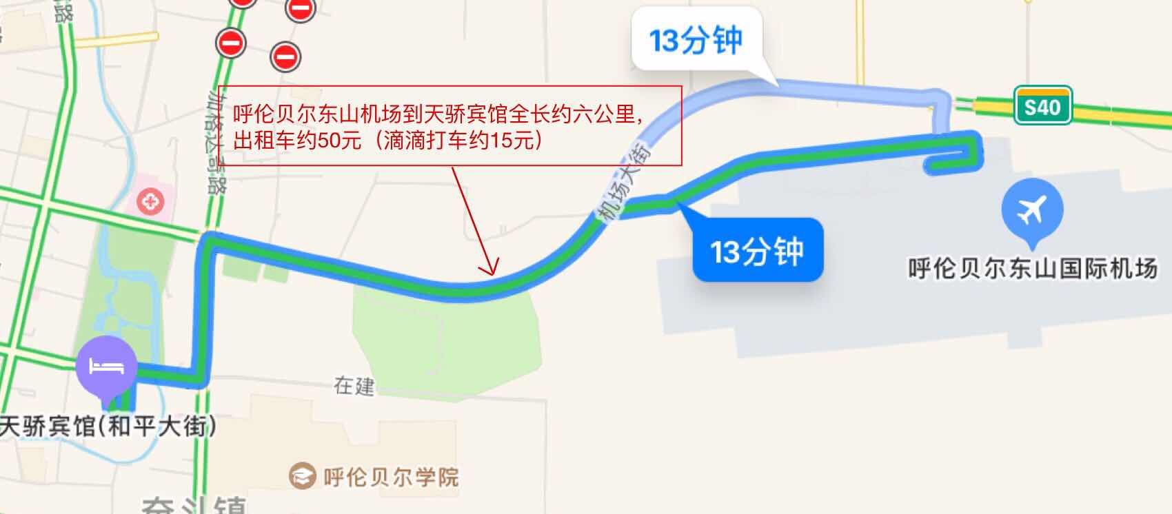 呼伦贝尔东山(国际)机场——天骄酒店:出租车约50元(滴滴打车约15元)