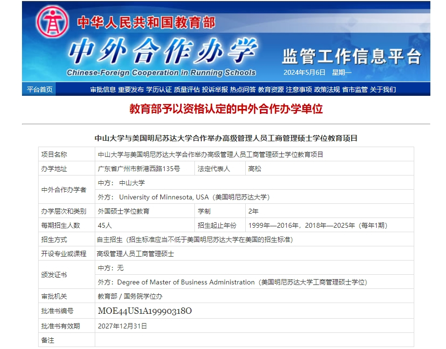 项目深耕中国24年,培养了600多名具有家国情怀、全球视野,通晓国际规则、胜任国际事务的高水平的企业领导者。在20个月的学习过程中,项目学员在国内yl9193永利集团(广州南校区)学习16门课程,最后一门 “海外游学”课程将赴美国明尼苏达大学(双城校区)参加海外课程学习、企业参访、毕业答辩及毕业典礼。项目学习与合作院校同步,学生在完成学业后,可获美方合作院校颁发的工商管理硕士毕业证书,并同步在中国教育部留学服务中心申请国外学历学位认证书。